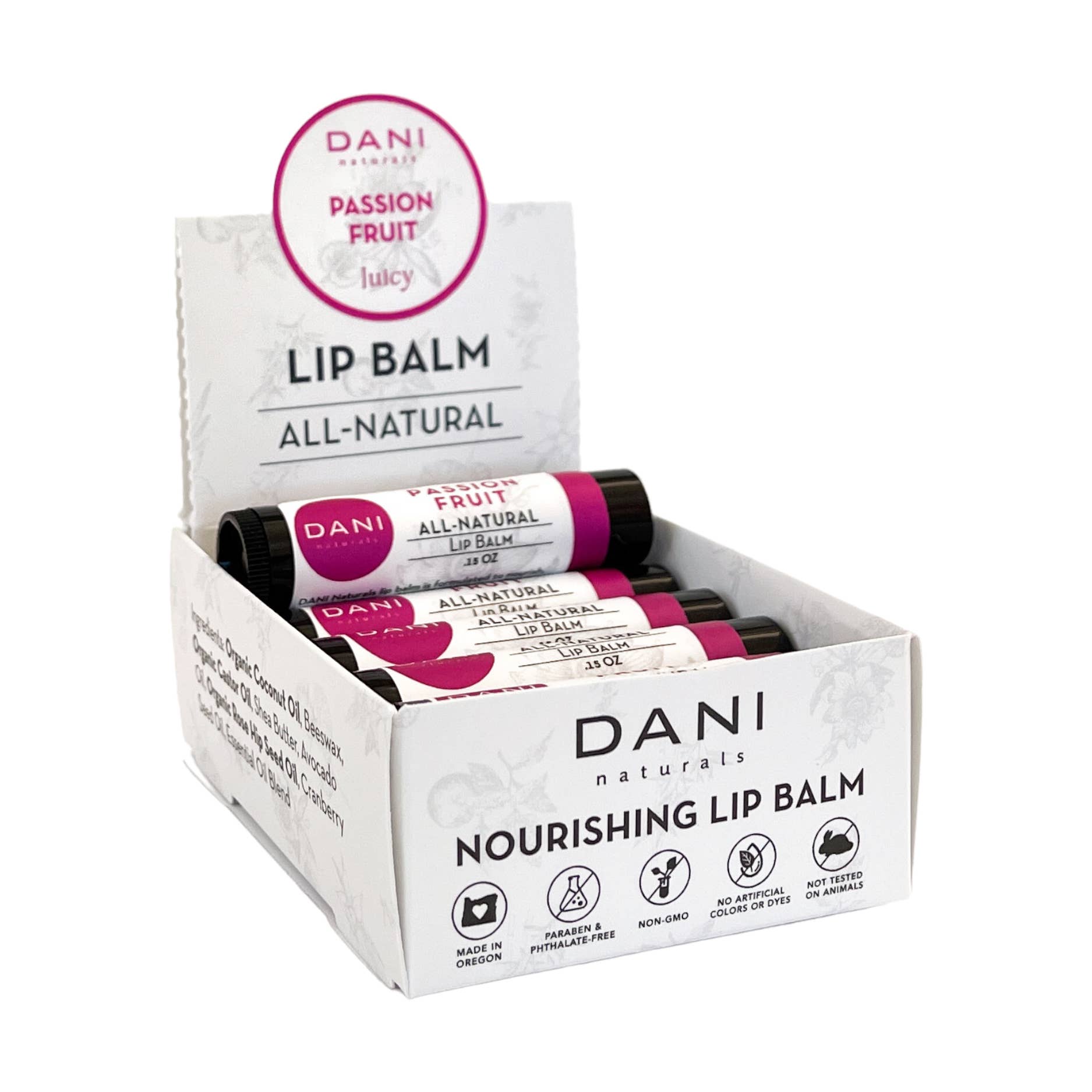 DANI Naturals Lip Balm is formulated to nourish and protect dry lips - perfect for everyday use. Made with natural and organic ingredients, our lip balm soothes and moisturizes plus is gluten-free! The Scent: DANI's Bamboo Bergamot is a crisp, fresh blend of bergamot, cucumber, and melon... clean and spa-like! This is what FRESH smells like. DANI's Bamboo Bergamot Lip Balm is: • Made with Natural and Organic Ingredients • Non-GMO • No artificial fragrances, colorants, and dyes • Ideal for Men and Women • Paraben-Free • Phthalate-Free • No animal by-products & Cruelty-Free • Made in Bend, Oregon with love Each case pack box contains 12 lip balms, and the box doubles as a point-of-sale display.