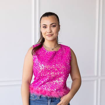 Feather or Not Sequin Crop with Feather Trim, Hot Pink