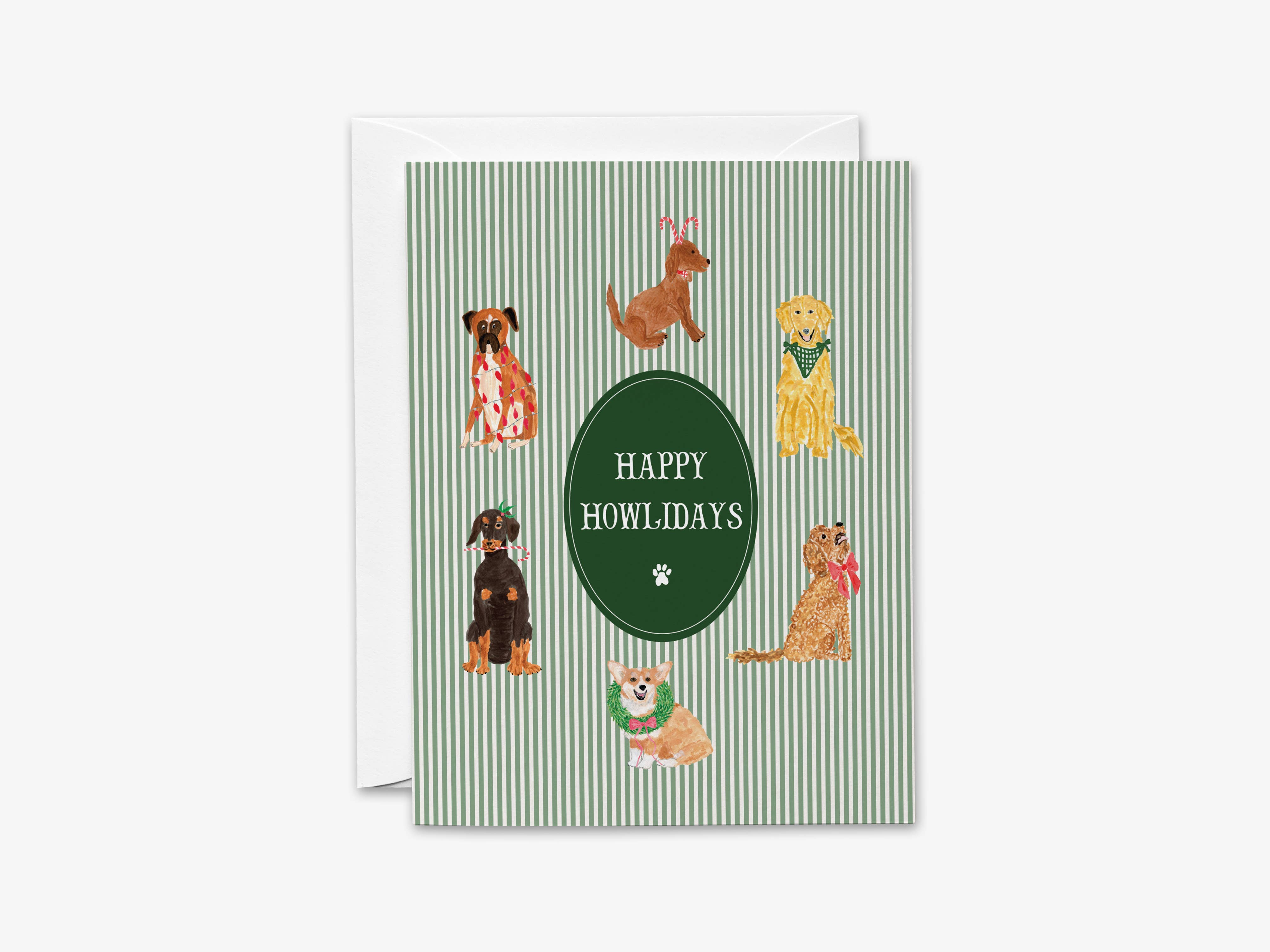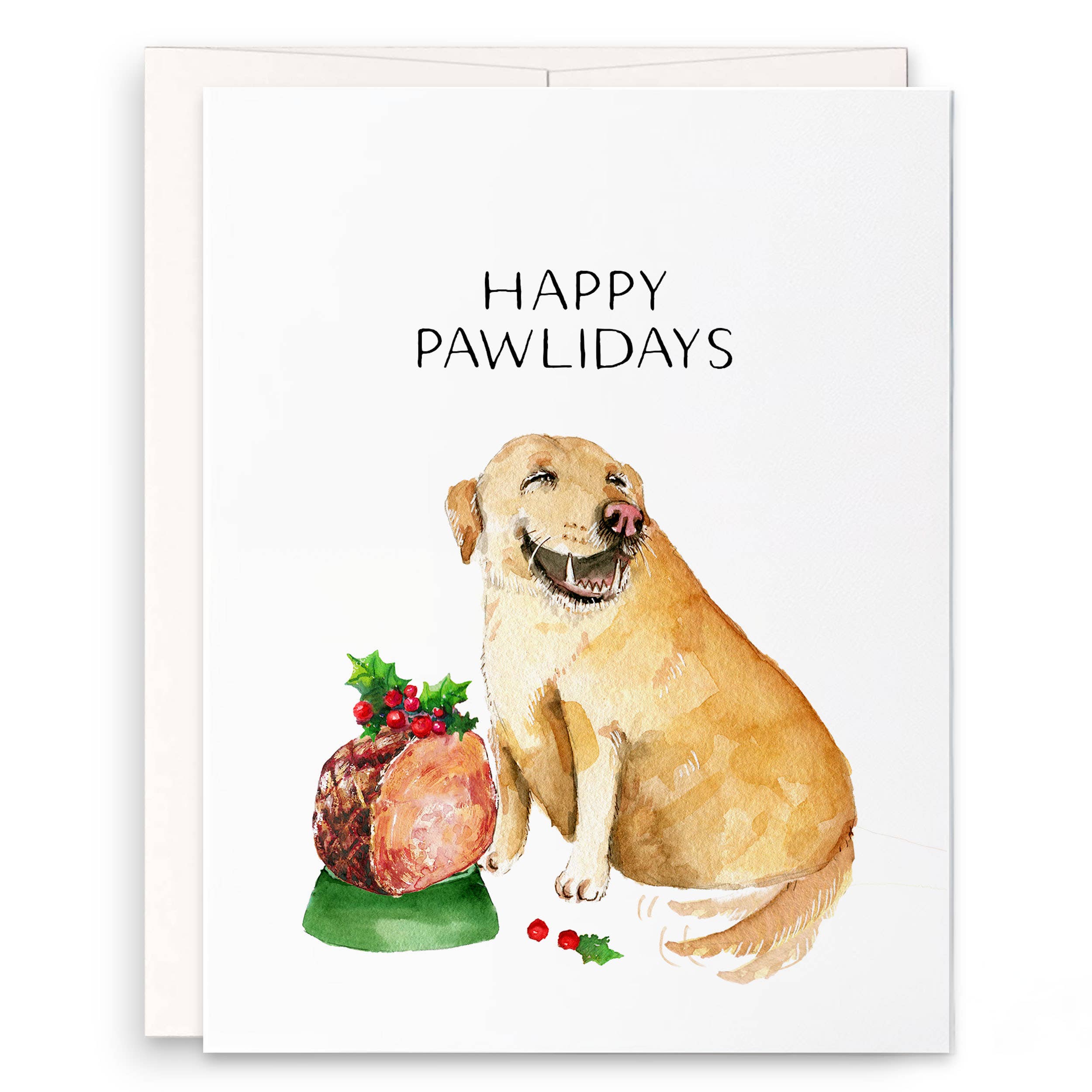 "Happy Paw-lidays!" A cheeky chunky dog smiles to the Christmas ham fest. This cute watercolor holiday card is the perfect winter greeting for dog lovers. -Boutique A2 size (4.25" x 5.5") Saves shelf space • Blank inside for any occasion -Heavyweight FSC-certified paper Premium quality • Eco-friendly -Matching envelope included Packaged in clear cello • Plastic-free option available -100% handmade in California, USA Original artwork • Not sold on Amazon or big box stores **Resellers welcome to use Liyana Studio’s descriptions and images for online listings and social media.
