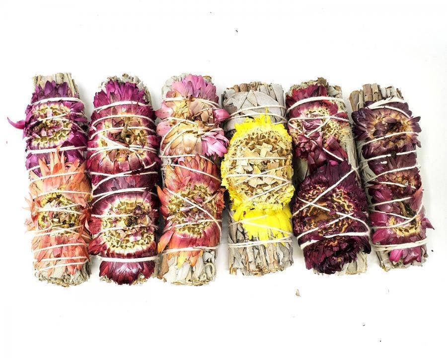 Introducing the 7 Chakra Sinuata Flower White Sage 4" Organic, Grown in California Seven Color Sinuata Flower and White Sage 4" 7 Chakras smudge stick! This unique and vibrant smudge stick is a must-have for anyone seeking to purify their surroundings and enhance their spiritual journey. Hand-tied with care, each wand is crafted using seven colors of Mullein Flower, symbolizing the seven chakras. Sourced from the majestic mountains, our smudges and herbs are renowned for their powerful purification properties. Experience our smudge stick's transformative power by lighting it or burning the herbs. Watch as negative energies dissipate, leaving behind a serene and harmonious atmosphere.