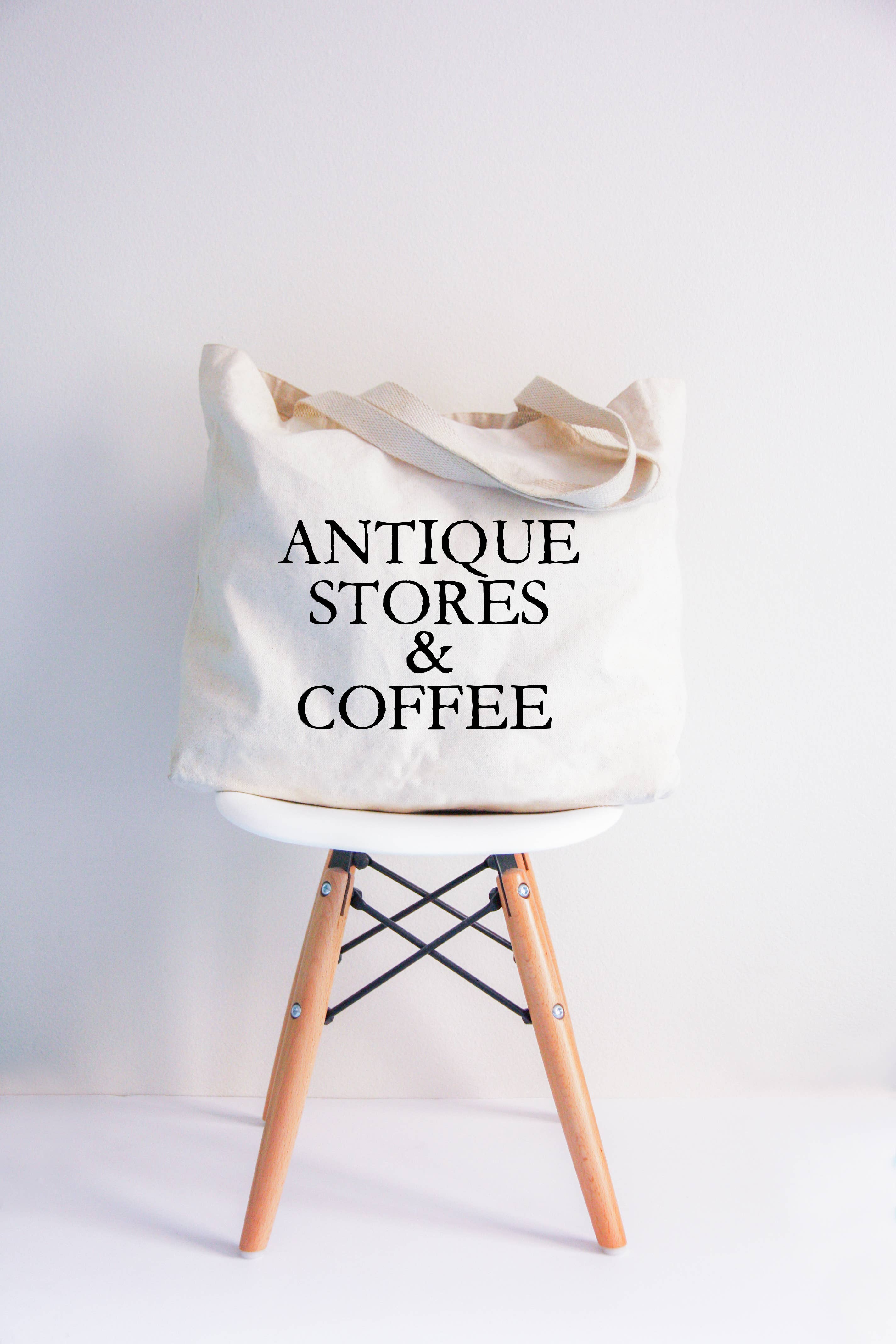 Thrifting & Coffee Tote Bag 2 SIZES Medium Measures 15"W x 16"H x 3"D Large Measures 20"W x 15"H x 5"D Both Handles 22" in Length 100% Cotton