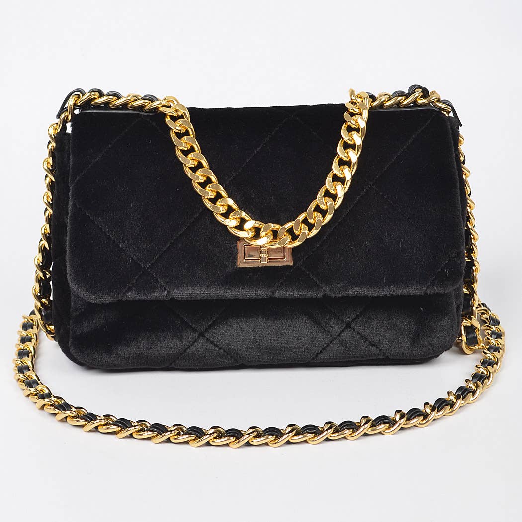 This sassy little clutch boasts a quilted pebble grained exterior and a chain strap for an edgy, up-front look. The turn lock closure adds another hardware forward element to the bag, while the interior has an extra pocket to keep your evenings out a bit more organized. All bags feature quilted exterior, matching topstitching, gold-tone hardware, chain strap and turn lock closure. PRODUCT DETAILS: - Primary Closure Type: Turn Lock - Measurements: 7.5"L x 1.5"W x 5"H - Removable crossbody strap: 21" drop - Interior: 1 zipper pockets - Hardware: Gold-tone - Care: Spot clean - 100% Vegan leather HB2246