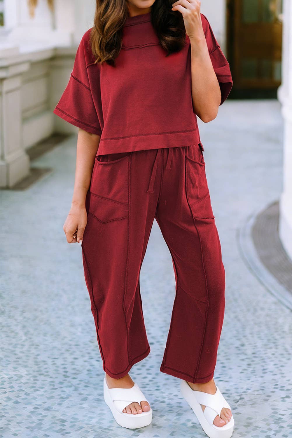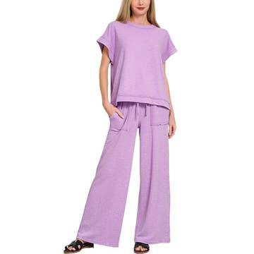 Embrace effortless style and comfort with the Vibrance Flow 2PC Set, available in five striking shades: black, purple, pink, dusty pink. and olive green. This lightweight matching set features an oversized short-sleeve top with a round neckline, paired with flowy wide-leg pants that boast an elasticized drawstring waist and functional pockets. Perfect for warm weather and adaptable to any occasion, this set blends ease and elegance for a fashion-forward statement. Note: These are garment measurements without packaging. Measurements are taken from size S/M and may vary slightly by size. The fabric has a slight stretch for comfort.