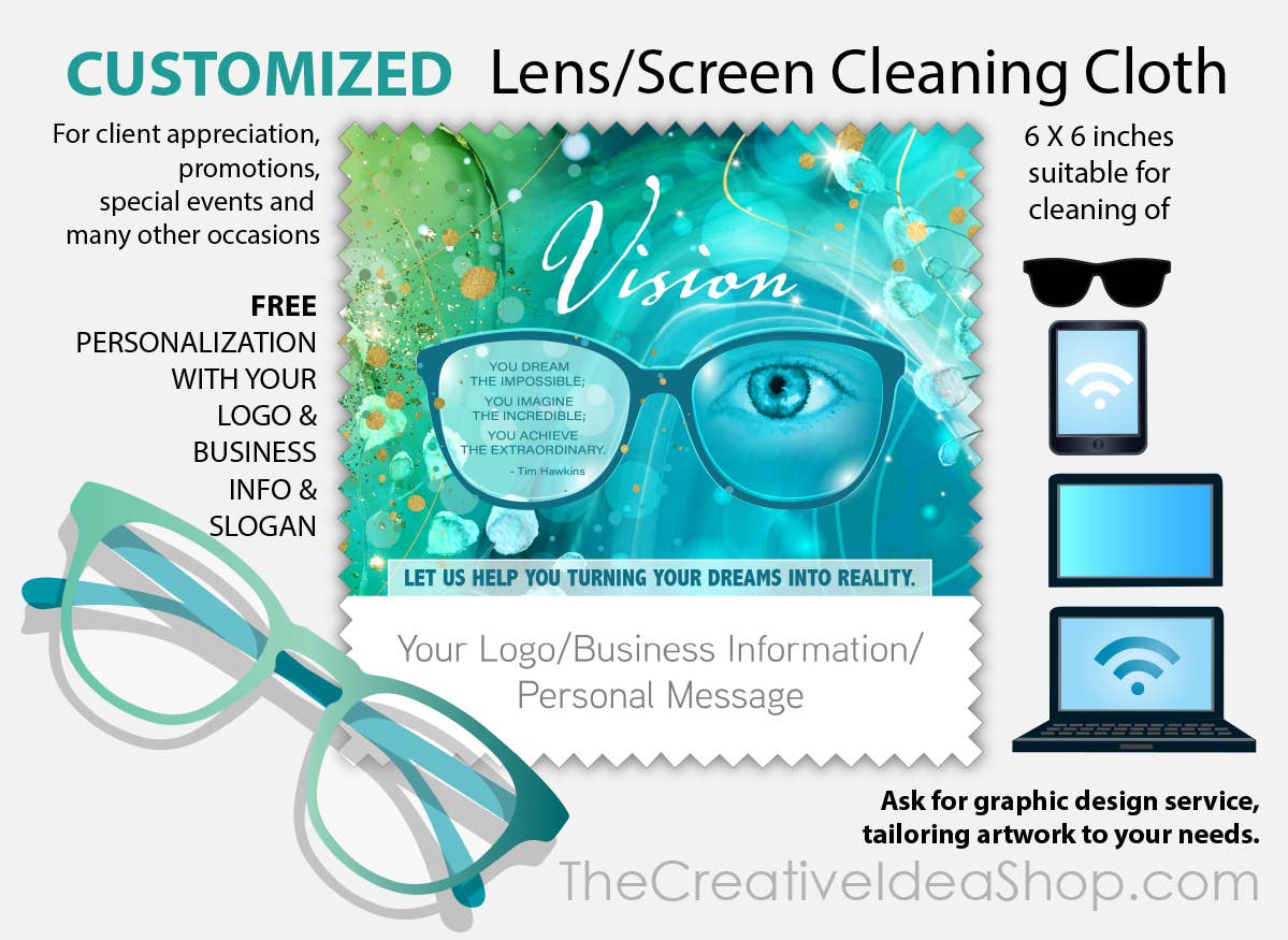 CAN BE CUSTOMIZED! 6 x 6 inches microfiber designer cleaning cloth, FREE personalisation with your business logo/information/slogan. Theme "What the World needs now". For promotions, client appreciation, special events or marketing your business focused on your customers and success! Cleaning eyeglasses or/and screens of smartphones, tablets and laptops We also offer full custom design service, tailoring this product to your needs, please contact us with your inquiry.