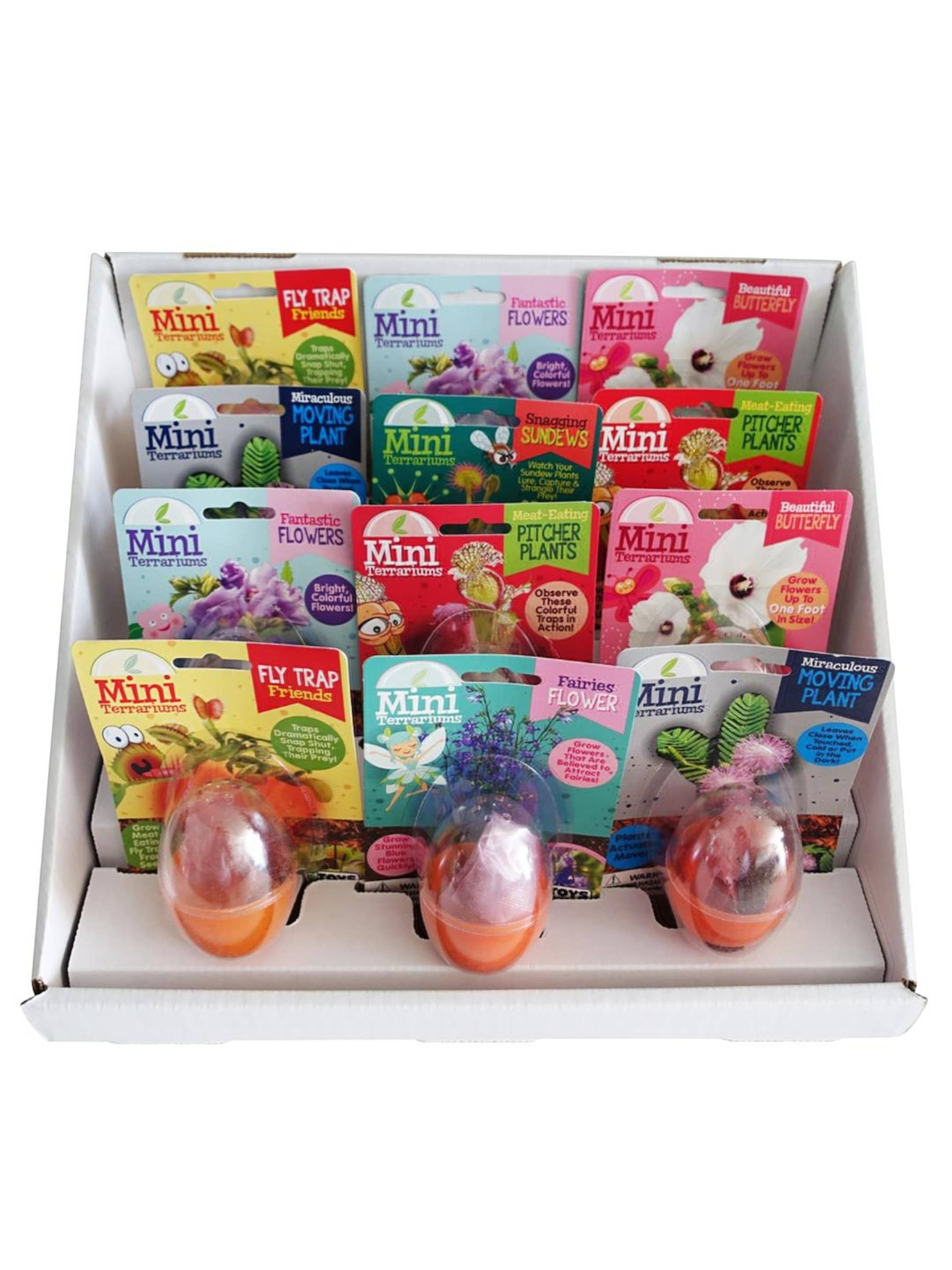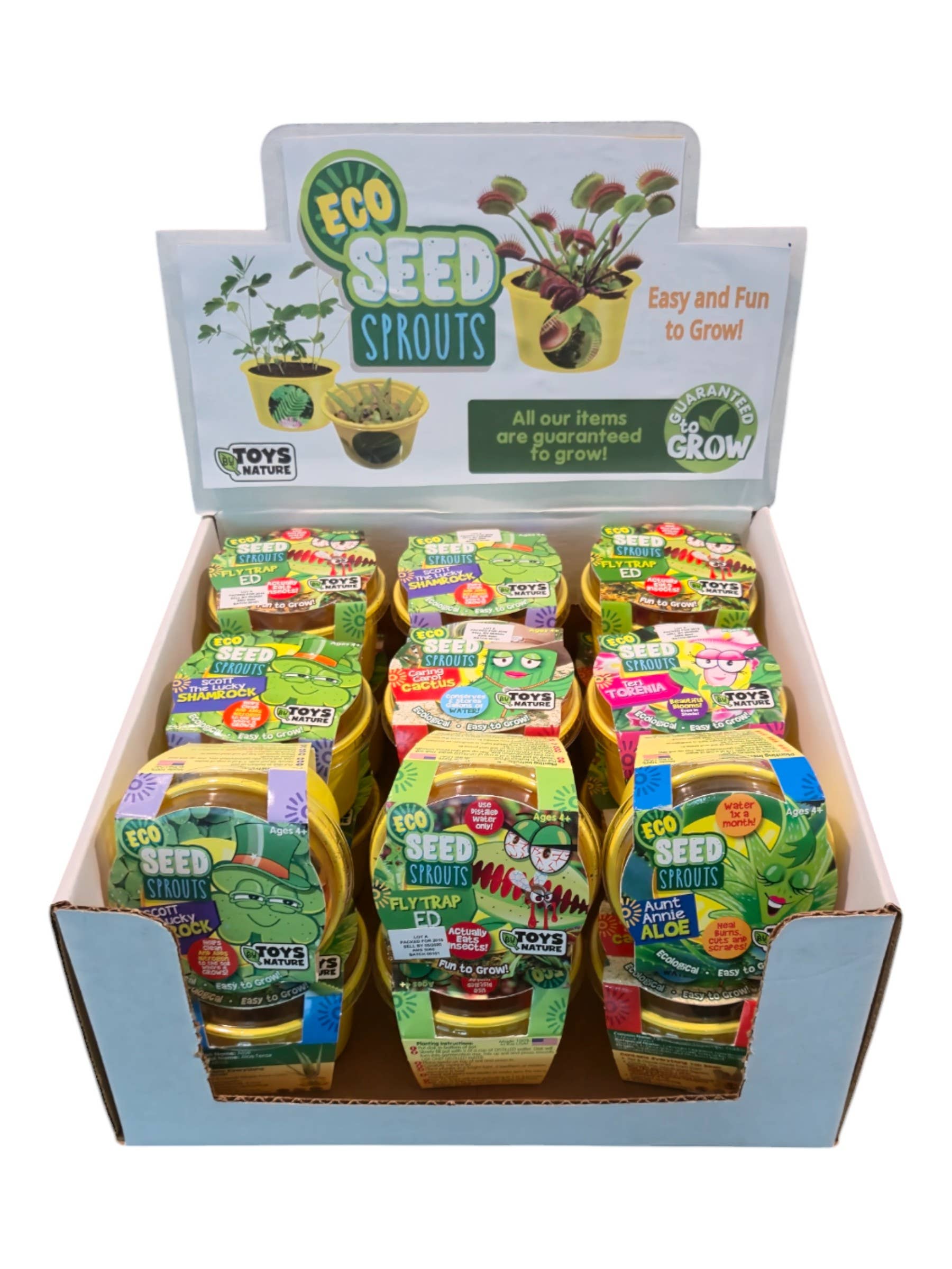 Our Eco Seed Sprouts bring the fun into growing! Grow 6 of the most amazing botanical buddies one could have! There are 6 varieties of astounding specimens including plants the eat meat, move, bring luck, thrive with almost no water, heal burns, and boast incredible diamond shaped flowers that flourish in shade! The display comes with 18 Eco Seed Sprouts, 3 of each type! Each Eco Seed Sprout also comes with an exclusive three sticker set to decorate the planter! Display includes 3 each of 6 varieties: Aunt Annie Aloe x3 Caring Carol Cactus x3 Fly Trap Ed x3 Michele the Mover x3 Scott the Lucky Shamrock x3 Teri Torenia x3 Each Eco Seed Sprout Contains: Pot and Lid Seeds Premium Sprouting Mixture 3 Stickers Size Information Package Size: 5.75” x 5.75” x 5.5” Assembled Terrarium Size: 5.75” x 5.75” x 5.5” Display Size: 10.5" x 10.25" x 7.4" Product Weight: 0.08 Pounds A tiny eco-friendly kit with a big personality- just add water and watch your new plant pal grow! Perfect Impulse Price Point -Easy “yes” for parents and gift buyers -Ideal for checkout and kids’ sections -Encourages multi-unit purchases Character Based Collectability -Named plant characters spark curiosity and attachment -Kids want to collect more than one -Drives repeat visits Small Footprint, High Turnover -Minimal shelf space required -Lightweight and easy to display -Strong margins on a simple kit Low Risk, High Delight -Straightforward product, fewer questions or returns -Simple growing experience -Clear value at an accessible price