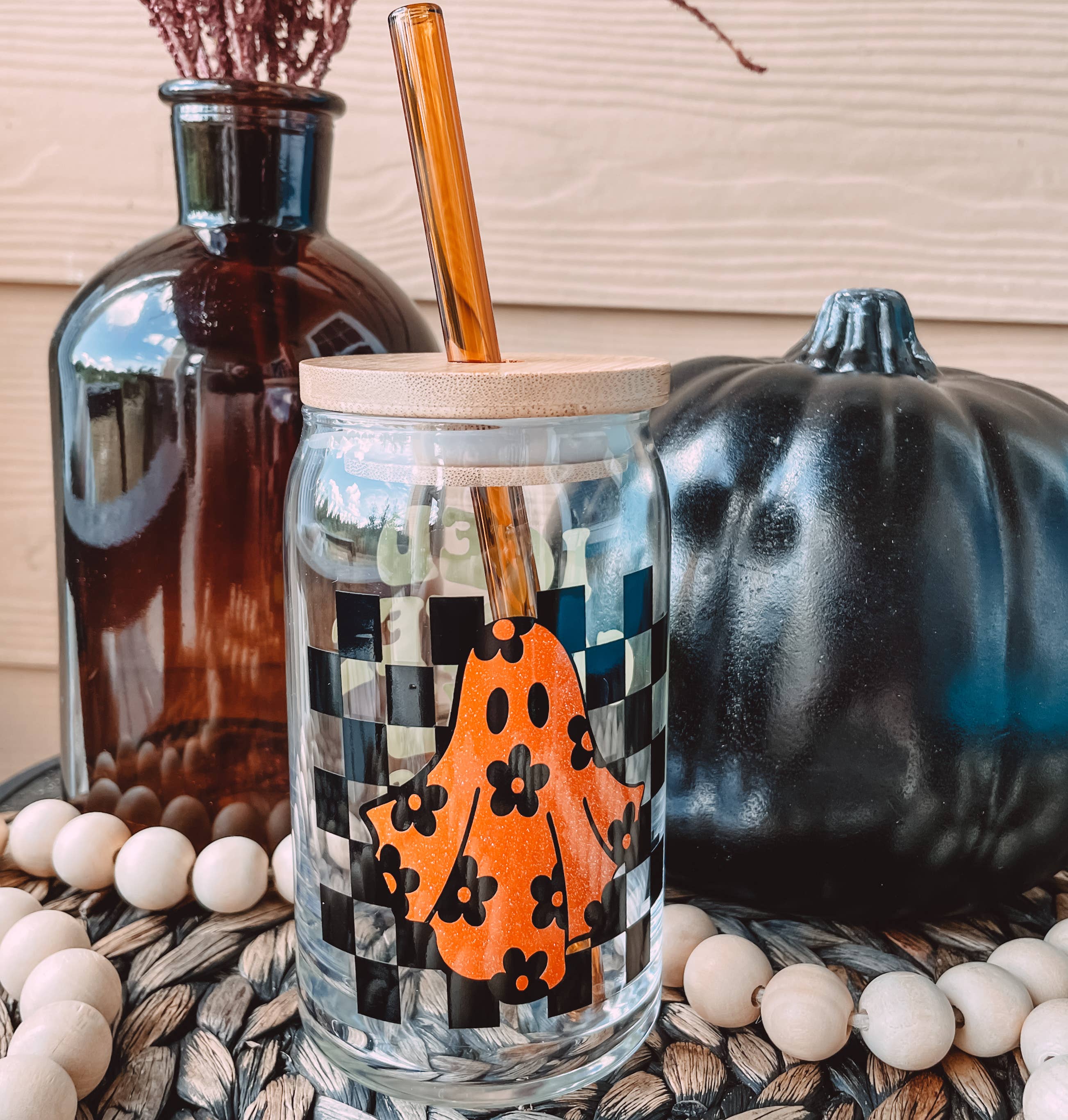 Cute Ghost Fall Halloween Glass Can Cup The perfect glass for any drink, any time of day! Iced coffee, beer, wine, smoothies, juice, and more! Glass drinkware featuring happy and uplifting designs to put a smile on your face. About the glass can: 16 oz glass can. Glass is made to order with permanent vinyl. Designs are created and hand-placed by me! This listing is for one glass. STRAW AND LID NOT INCLUDED Care instructions: Gentle hand wash only, not to be put in the dishwasher or microwave. Care instructions included with your order.