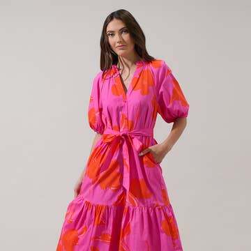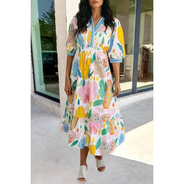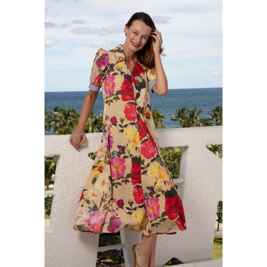 SKU: D8020, D8020, D8020 Made in China Aesthetic: Casual and Romantic / whimsical Neckline: V-neck Occasion: Day Party and Resort / Vacation Pattern: Floral Skirt & Dress Length: Midi Sleeve Length: Short Sleeve Fabric: SELF:85% Rayon 15% Cotton LINING:100% Cotton
