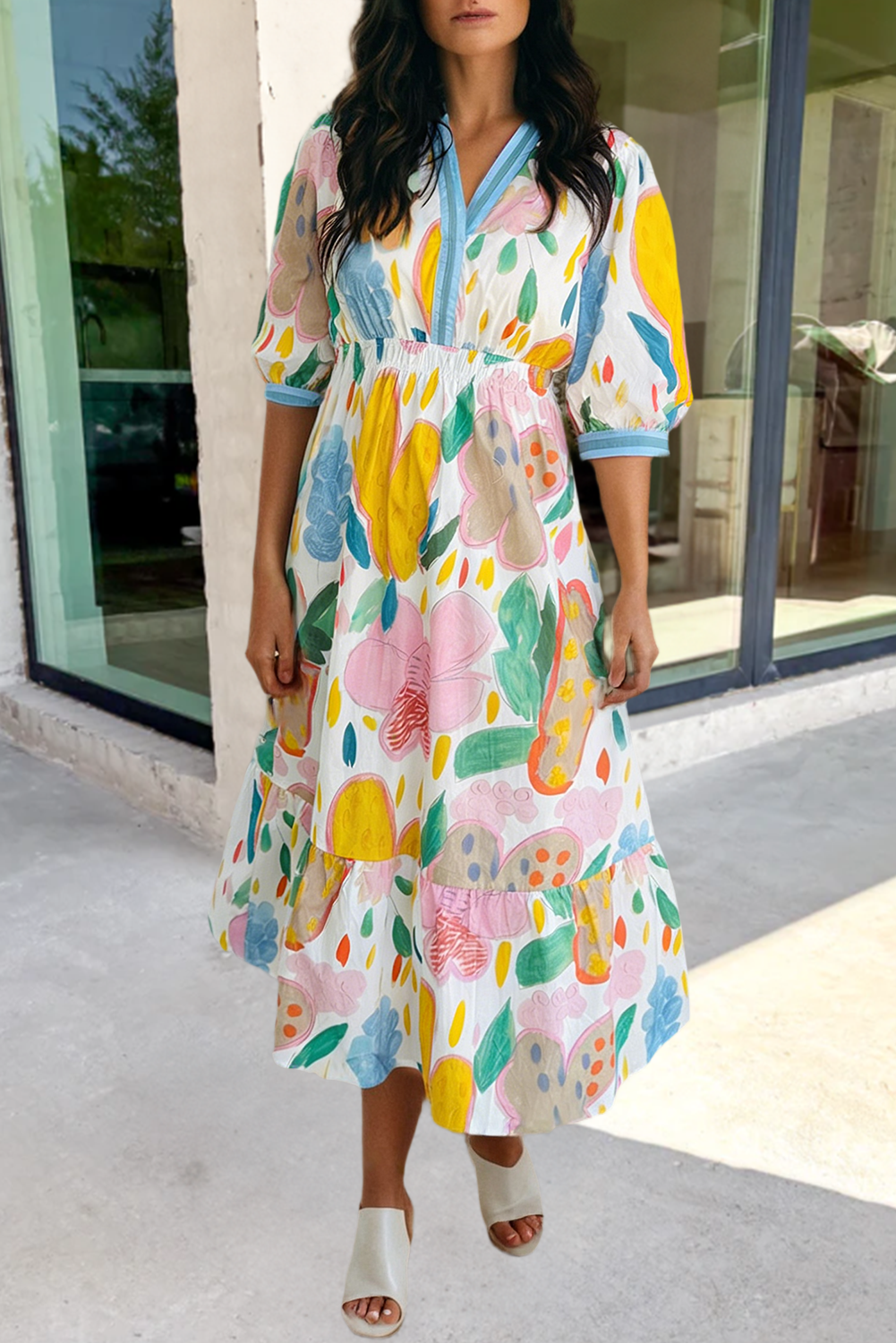 No reviews for Ruffle V-Neck Puff Sleeve Waist Pleated Midi Dress yet.