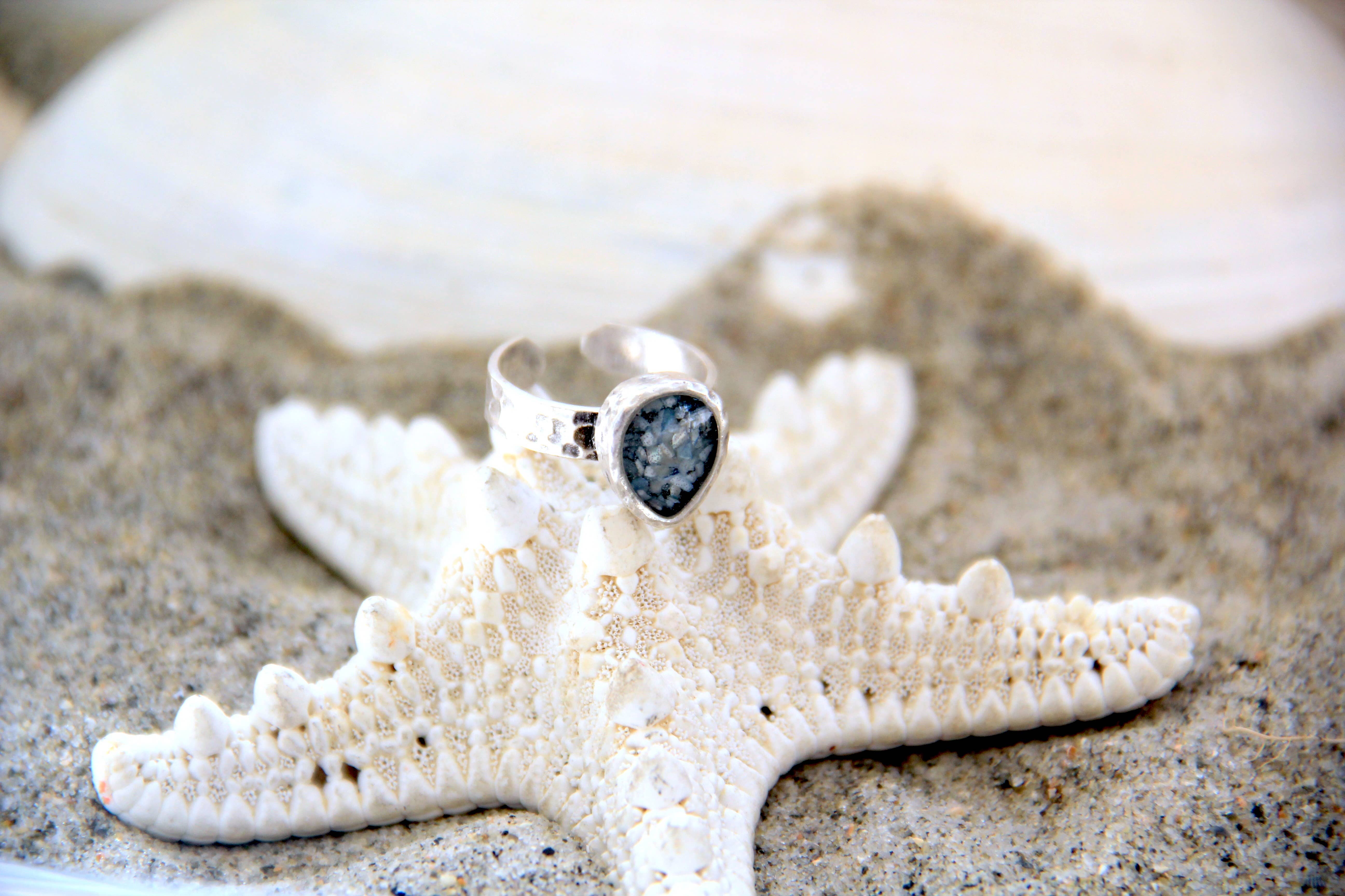 Our Antique Silver Oval Ring is fully adjustable and comes in all 10 of our crushed shell colors. We hand lay all of our shells, making each piece we create unique! Comes beautifully boxed in our wood and linen ring box.