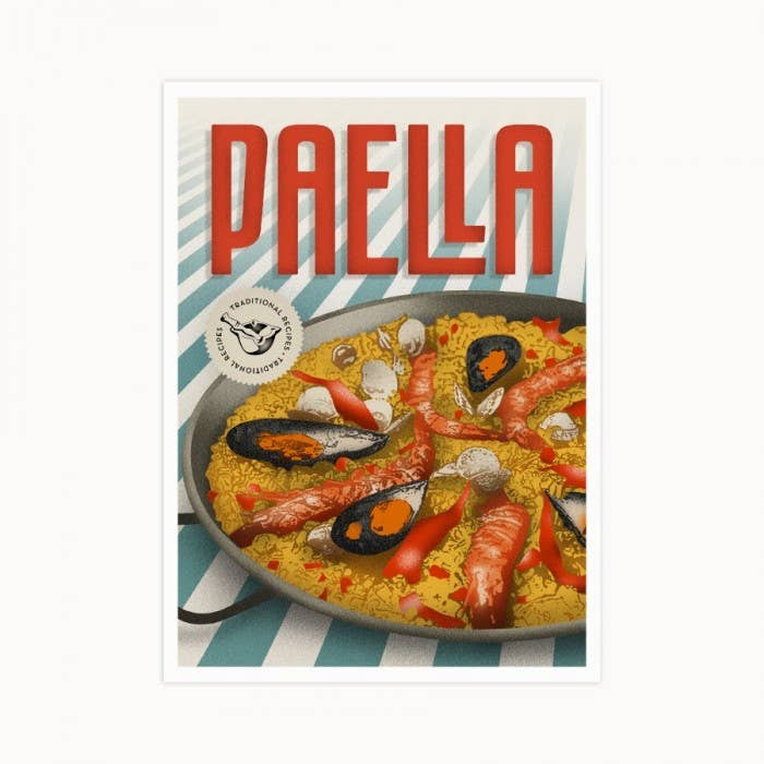 Postcards of traditional recipes. Collection of postcards depicting traditional Spanish cuisine with vintage illustrations. Illustrations of paella, potato omelet, fried fish, sangria, gazpacho, crème catalana, bread with tomato and sweet potatoes. Product Information: Offset printing on 30% recycled paper. Dimensions: 16.5 x 12 cm