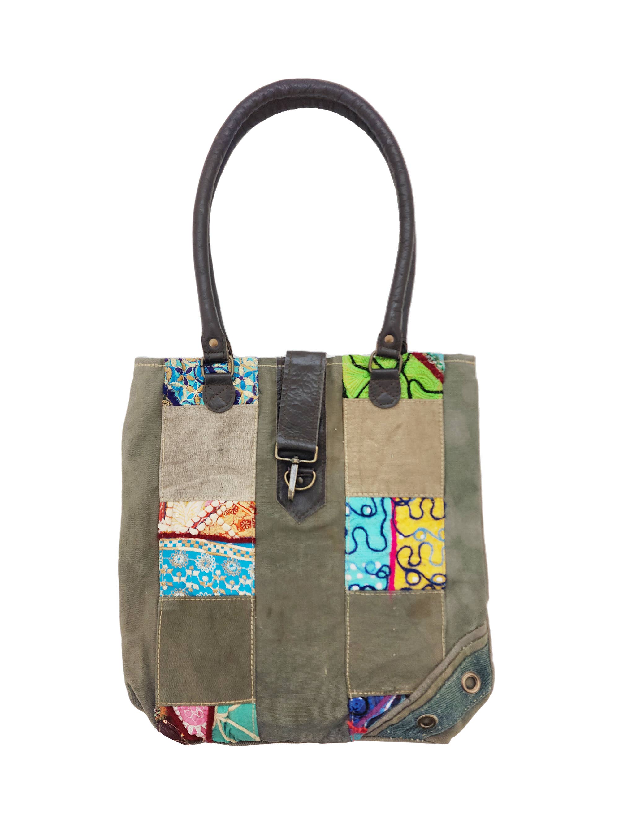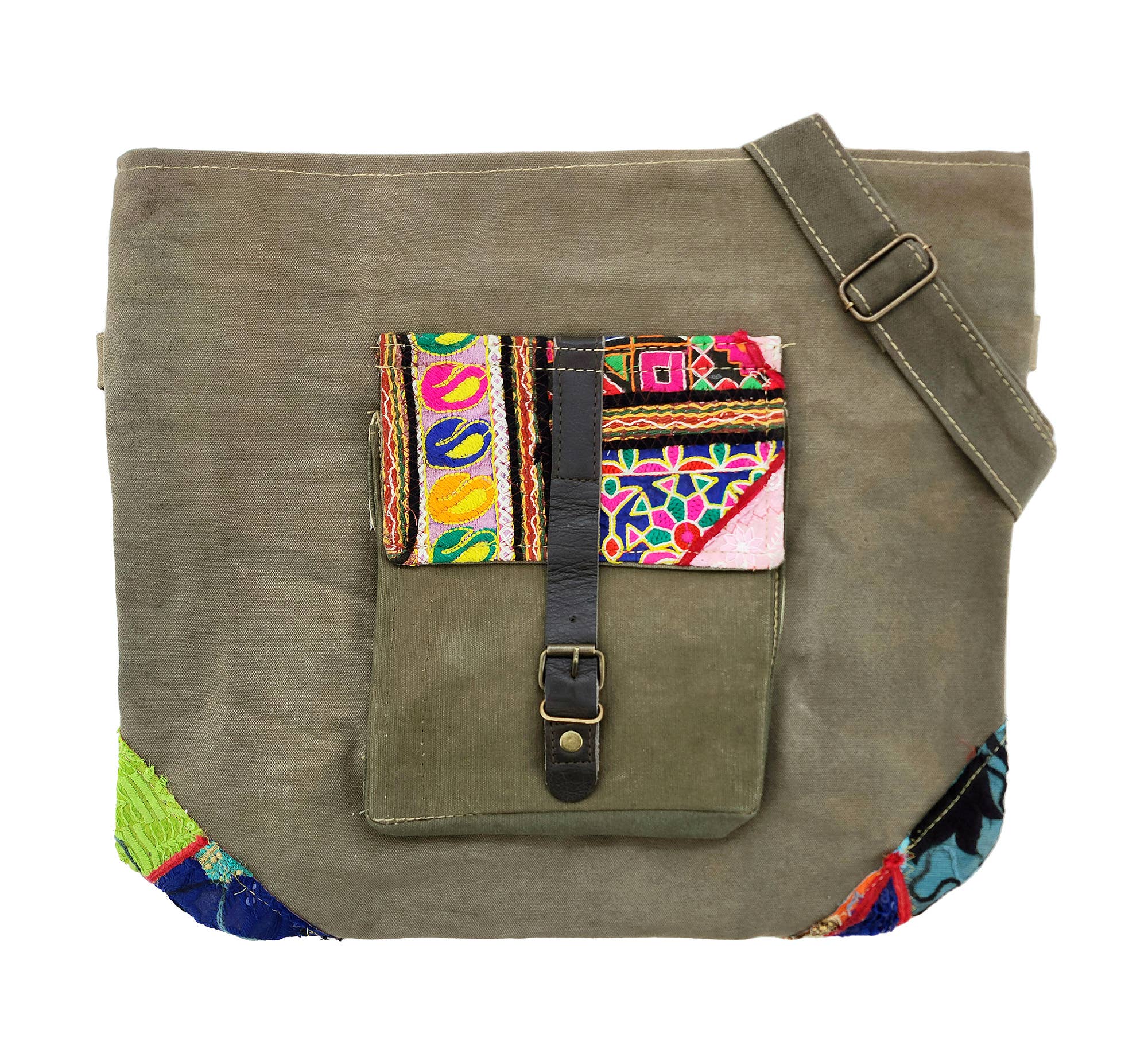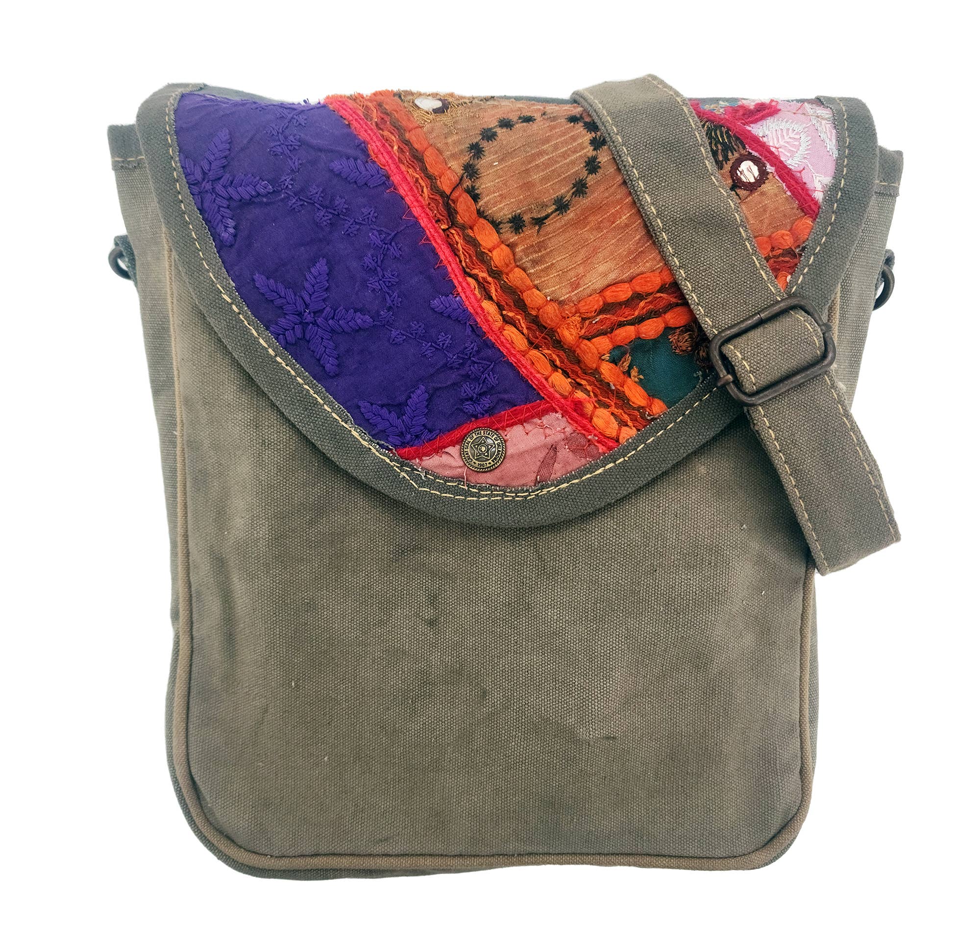 Our fully lined recycled military tent bag accented with unique vintage fabric & textile pieces features long backpack-style carrying straps, a top main zipper, 2 front exterior large open pockets and 1 interior zip pocket. DISCLAIMER: Our recycled military tent bags are a tribute and a reminder of the sacrifices and contributions of military veterans. Please know that these bags are made from authentic used military tents not brand-new canvas packaged as recycled tents or tarps. THESE ARE THE REAL DEAL! As a result, the tent material will show signs of worn-like imperfections which add to its character. Each bag has differences in genuine imperfections, stains, and colors. Your bag will be as unique as each soldier's experience when seeking shelter in these tents whether in the training field or in a combat zone. Vintage fabrics are not repaired, they will have distinctive characteristics of worn threads, sequins and or beadwork. No two bags are alike. All Sales Final