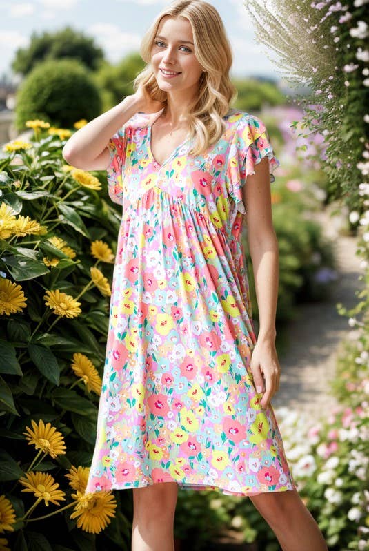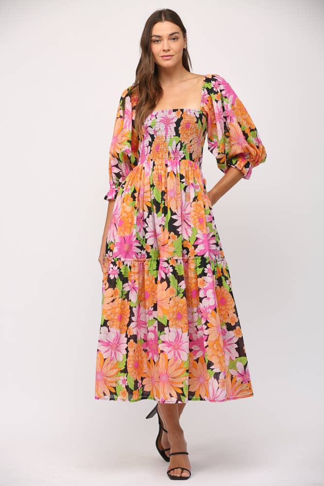 This dress features a vibrant magenta floral pattern, designed with a round neckline and long sleeves. Its loose fit provides a comfortable and flattering silhouette, perfect for an artistic, vacation-inspired look. Ideal for casual outings or holiday getaways, this dress combines bold color with effortless style, making it a standout piece in any wardrobe.