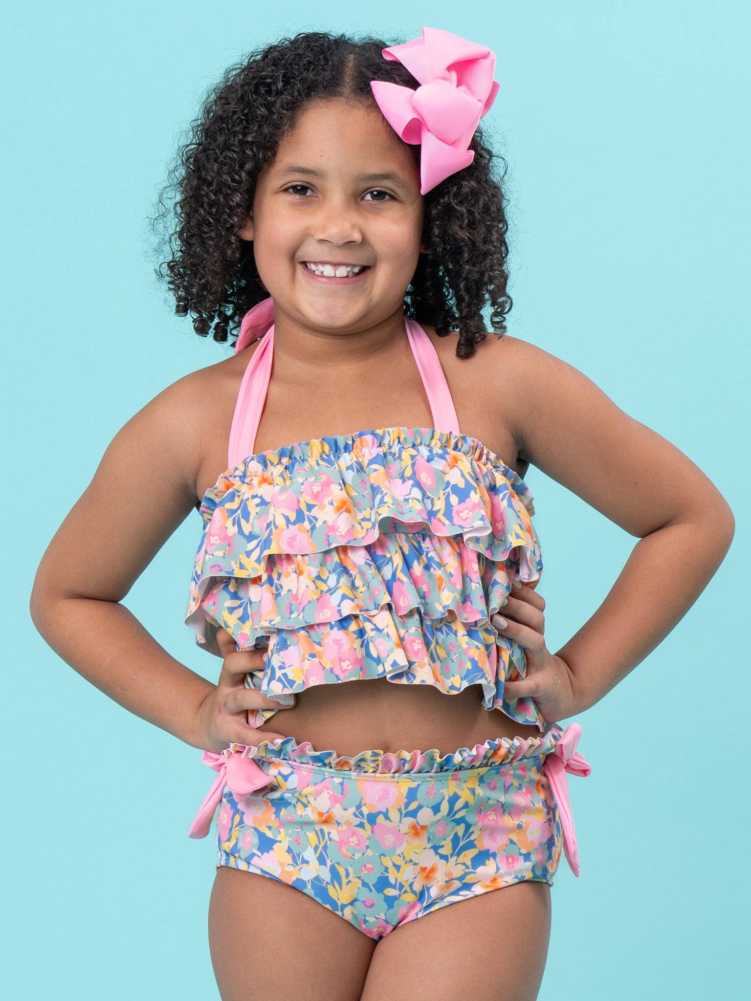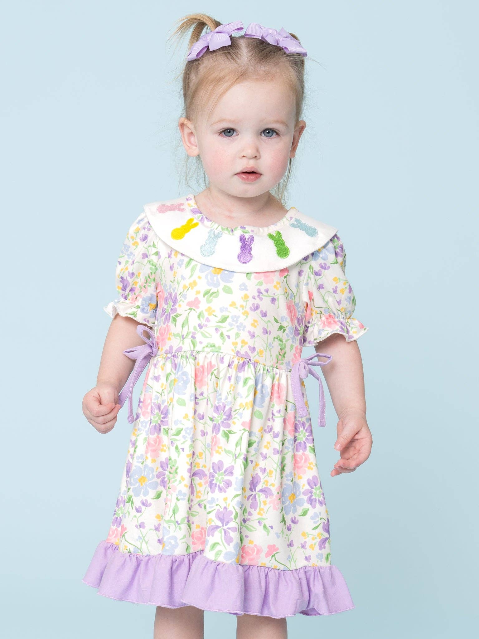 Hop into spring with our Bunny Floral Embroidered Ruffle Bubble! This adorable girls bubble features a whimsical watercolor garden print, with delicate bow and ruffle details. Embroidered bunnies on the collar add a sweet touch, making it the perfect Easter outfit. * Snap buttons. * Fits true to size. * 95% Polyester / 5% Spandex / Combo: 97% Cotton / 3% Spandex * Accessories sold separately. * Import.