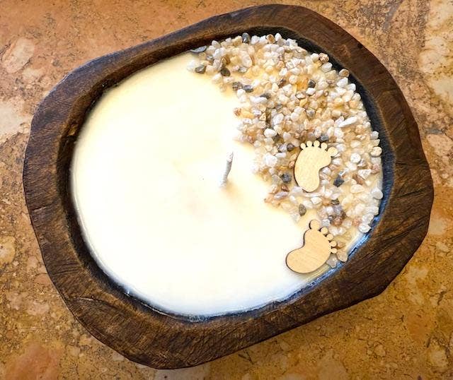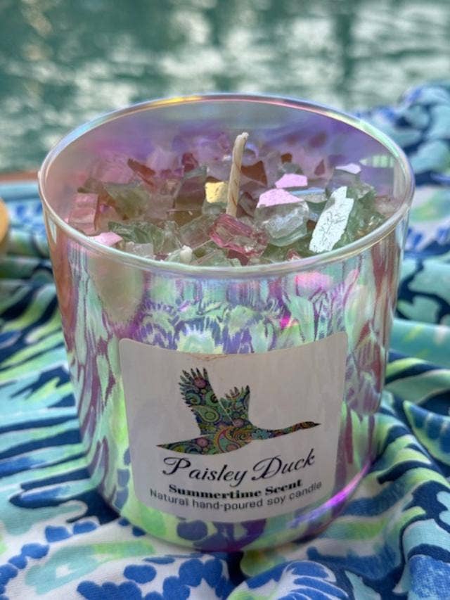 100% american farm grown soy wax infused with our Cool Water fragrance and handpoured into hand-carved turquoise panted round wood dough bowl with cotton lead-free wick and accented with velvet ribbon and a rubber ducky on top. Part of our Paisley Duck Coastal Collection. No artificial dyes or toxic chemicals used.