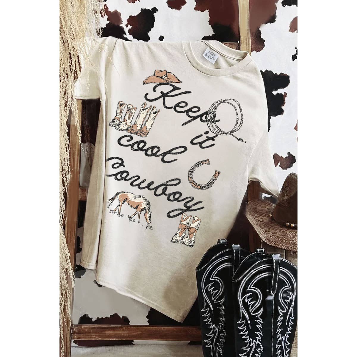 Discover the charm of the wild west with Ranch Swag's All Hat No Cattle Graphic T-Shirt. Designed for the woman who embodies a cowboy's spirit, this tee is more than just a piece of clothing, it's a statement. Made with Direct to Garment Printing, it ensures a durable and high-quality design that will last. This women's graphic T-shirt is not just an addition to your wardrobe but also a beginning of an epic outfit that reflects your style. Wear it with pride, and let your unique brand of YOU shine through.