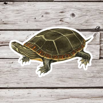 This is a glossy, waterproof, and UV resistant sticker created from an original Rachael Bee Artwork watercolor painting titled: "Bennet the Pond Slider Turtle".