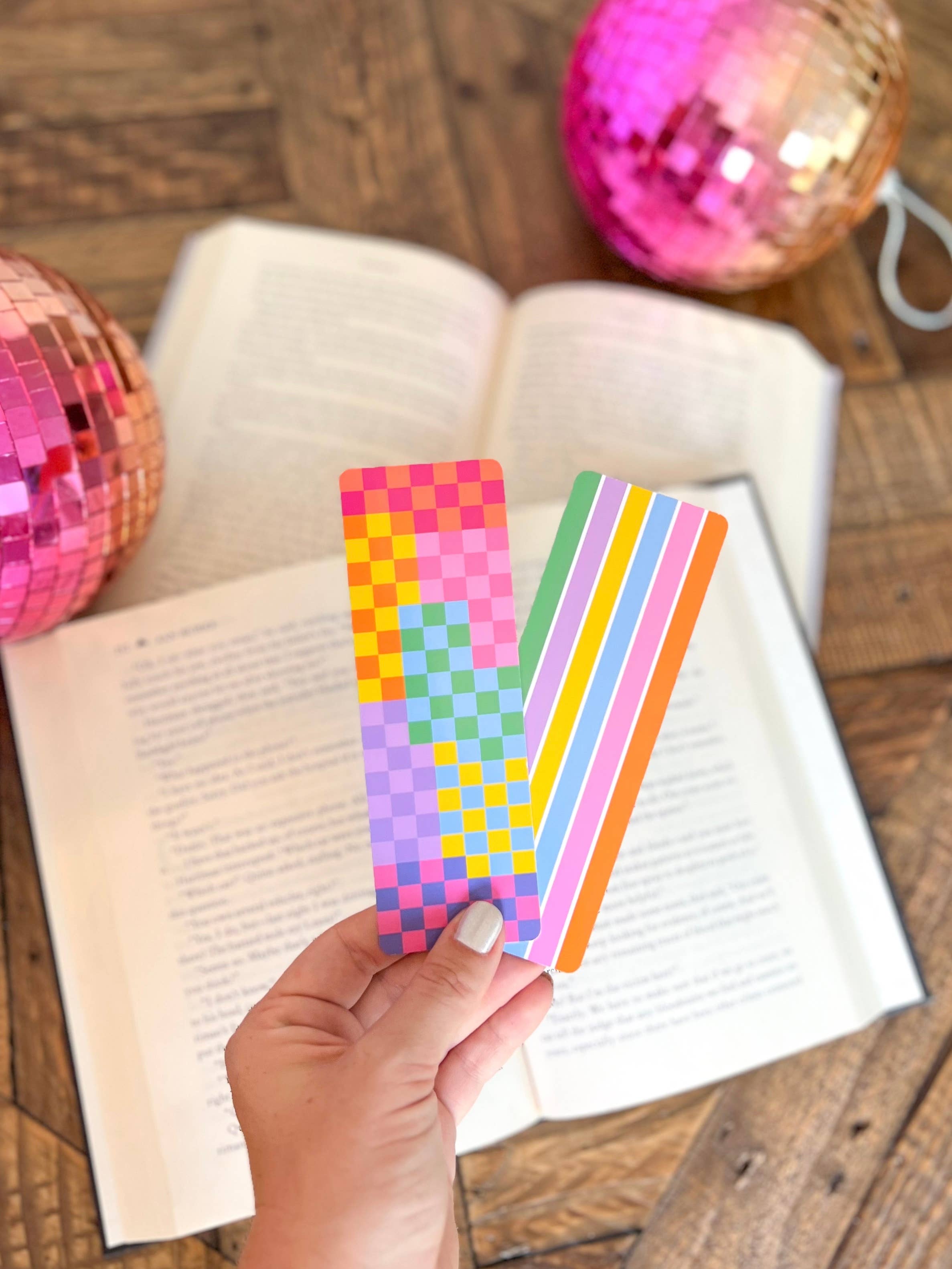 Specs: -Measures 2in x 6in -Double sided with a small logo on the back side -Professionally printed on 350gsm soft touch matte cardstock -Rounded corners -Laminated bookmarks will have a small border Standard bookmarks do not come with any sort of backing cards, etc. Photos shown are of the matte option. Measures: 2in x 6in spring bookmark, checkered bookmark, pastel bookmark, pink checkered, aqua checkered, purple checkered