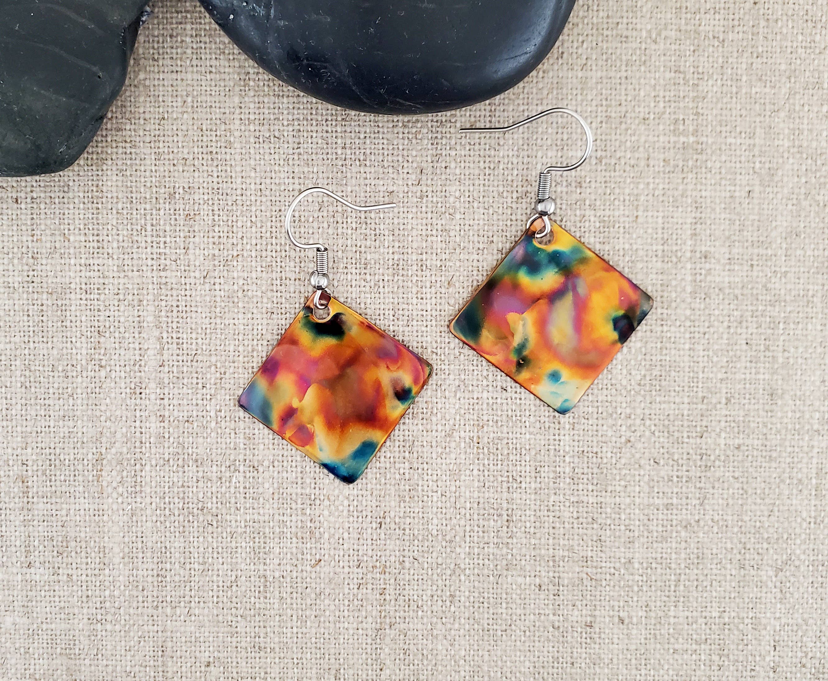Our very stylish earrings are ultra-light weight & water resistant. Each earring is a handcrafted UV giclée printed both sides on stainless steel. We use hypoallergenic, antique copper ear wires.