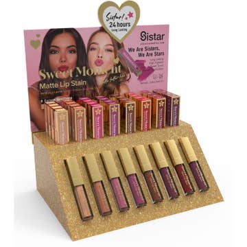 Sweet Moment Gloss Lip Stain Set What to know! A lip gloss that leaves a long-lasting tint. Our high coverage lip gloss glides on effortlessly and transforms into a lip tint to give your lips coverage all day. The rich pigmented colors will shine and define your lips. * 24 Hours Long-Lasting * Available in 8 Shades * High Pigment * Sweet Scent * Smooth Application ALL SISTAR PRODUCTS ARE CRUELTY & PARABEN FREE Additional Details Units Quantity [Display] SGLS001 | Pink Sherbet: 4 pcs + tester SGLS002 | Nudy Peach: 4 pcs + tester SGLS003 | Lovebird: 4 pcs + tester SGLS004 | Stiletto: 4 pcs + tester SGLS005 | Chocolate: 4 pcs + tester SGLS006 | Dusty Rose: 4 pcs + tester SGLS007 | Night Berry: 4 pcs + tester SGLS008 | Raspberry: 4 pcs + tester Inner Box Quantity SGLS001 - SGLS008: 6 pcs / box Master Case SGLS001 - SGLS008: 24 boxes / case Pack Type Corrugated Paper Display Size W 11.5” X D 8.25” X H 14” Net Weight 1.5 mL / 0.05 fl. oz. Formulation South Korea Origin P.R.C * This price includes payment processing fee and freight fee in US. If you want to pay it by check or wire-transfer, please send email to sales@smusacosmetics.com