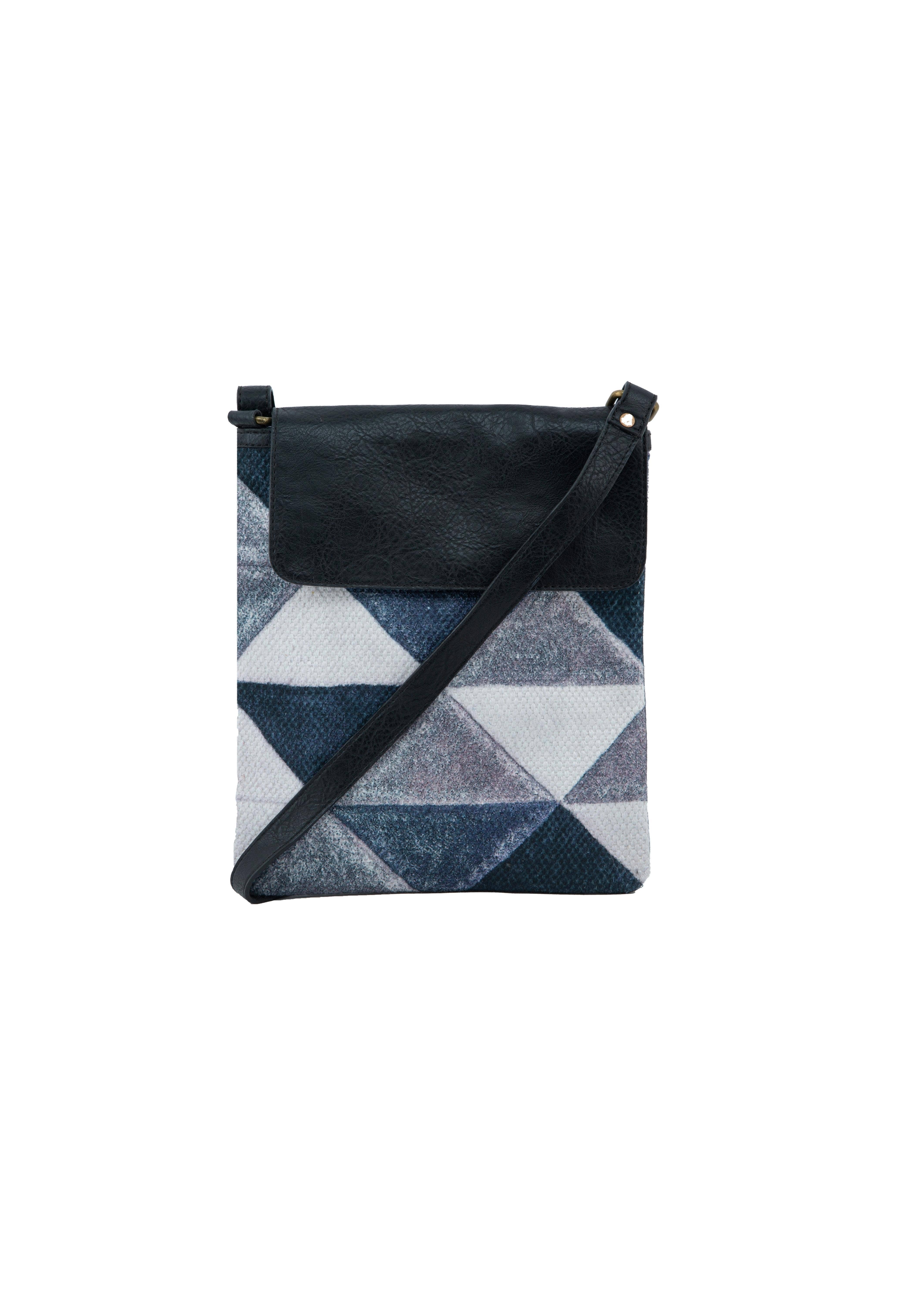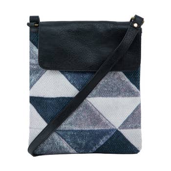 An art-inspired, vegan leather crossbody handbag at the perfect size for everyday essentials. Printed with resilient and vibrant UV inks, the textured pebble finish feels divine. Fully lined with dark blue twill, a sleek metal zipper and vegan leather tab pull allows for easy opening. Comes with wide fabric strap, and finer vegan leather strap as shown on model, to change up the look. Straps adjustable from 28 to 52 inches to allow for the bag to be worn at a shorter sling length, low or high crossbody, and as a classic shoulder bag. MATERIALS Vegan leather DETAIL Nine inches wide at base, ten inches wide at opening, by seven inches tall and two inches deep.