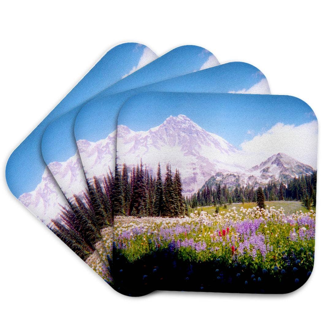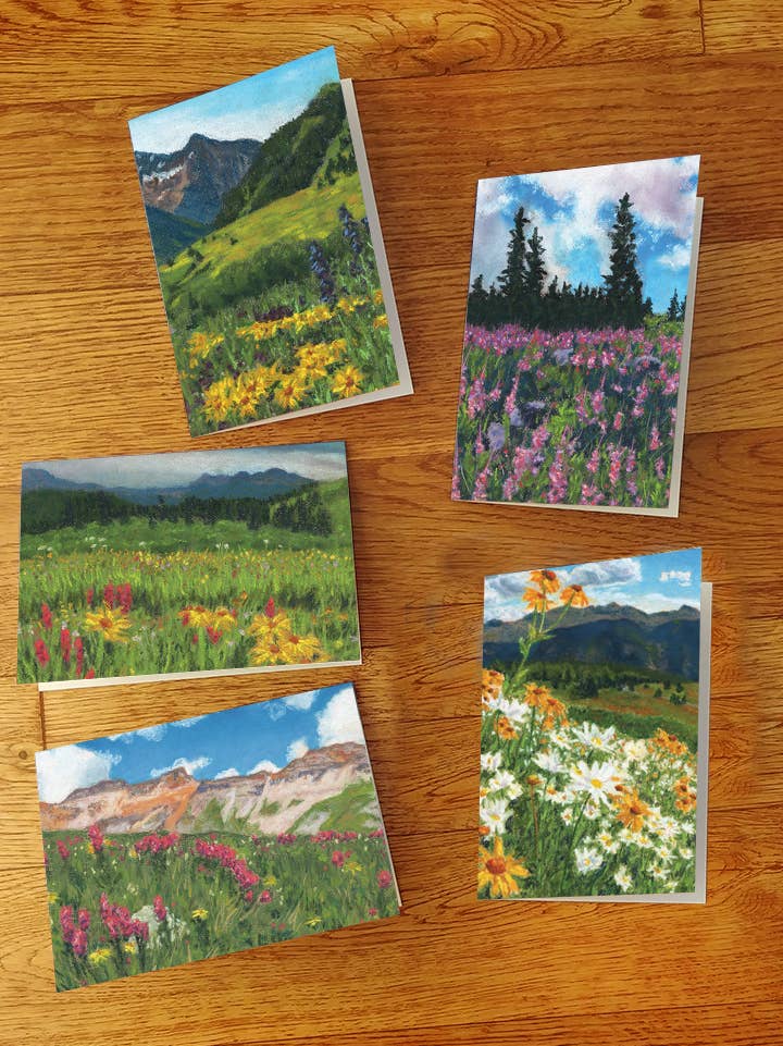 Set of four 3.825” square no-slip cork backing coasters, featuring original chalk pastel paintings of wildflowers in southwestern Colorado in the San Juan Mountains (hiking Engineer Mountain, Molas Pass, Animas Forks) near Durango and Silverton. Back of coasters feature the Duck Girl Art logo stamped. Sold in clear plastic container with thumbnail description of images on back.