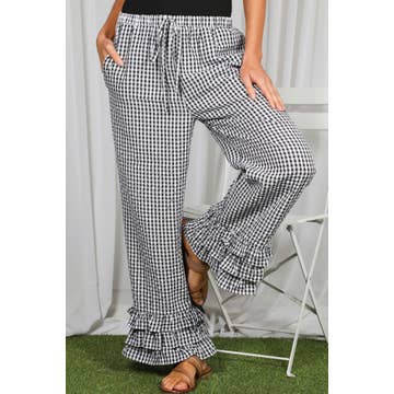 SKU: HWJ02538-Black-S Made in China Aesthetic: Casual Care Instructions: Hand wash Fit: Contemporary Occasion: Everyday and Loungewear Pant Length: Ankle Pant Style: Wide Leg Pattern: Plaid Rise Style: High Season: Fall/Winter Product Language: English Fabric: 100% polyester Weight: 170 g (6 oz) Product Materials: Vegan Packaging: Reduced Production: Fair trade