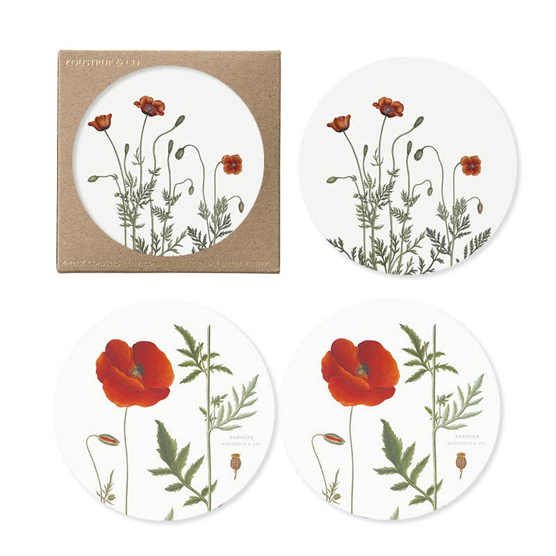 COASTERS - MONASTERY GARDEN - 4 PACK 2 sided Coasters for glass with motifs of flowers from the Monastery garden. Made in Europe of eco-friendly Nordic birch veneer. Dishwasher safe.