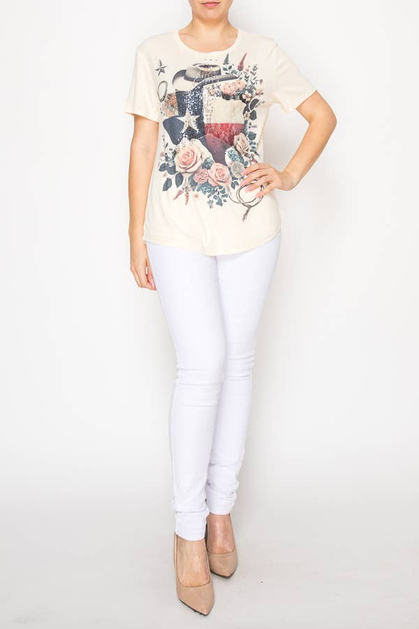 V-neck, below-the-elbow sleeve, front shoulder part embroidery. Processed and packaged in Italy. 100% Cotton. Front Body Length-22 1/2', Neck Line Point Sleeve Length --24 1/2'.