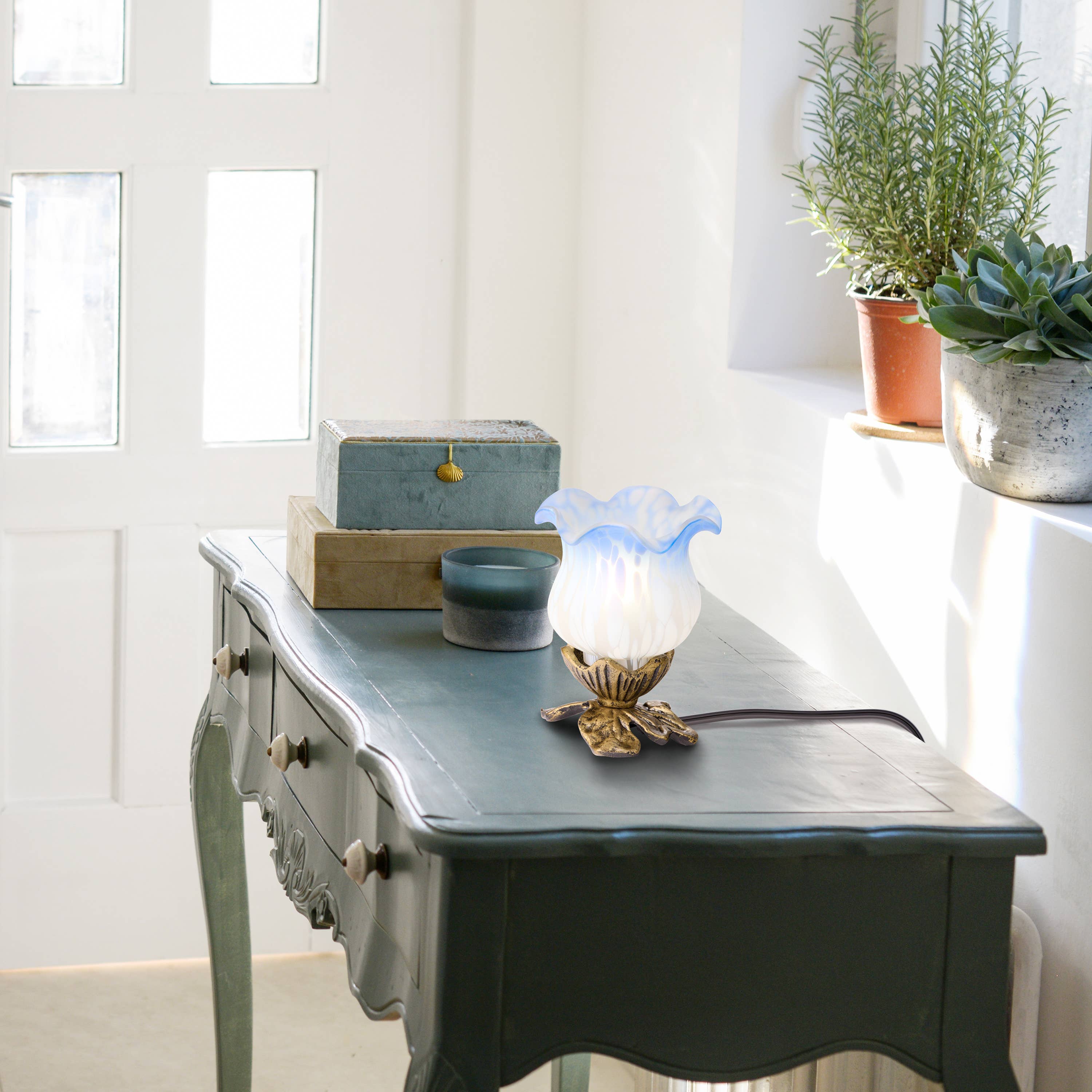 Faire Exclusive Product Add vintage style to your interior décor with this 8"H White & Green Lily Glass Butterfly Accent Lamp from River of Goods. This accent lamp features a lily-shaped shade made from glass in ombre green and white for antique charm, and it's crafted with a metal base for lasting use. A great accent piece for your coffee table, console table or mantel, it requires one 7-watt Type C bulb (not included) to give your space an eye-catching glow. Overall Dimensions: 4.625"L x 4.625"W x 8"H Lily-shaped novelty accent lamp Metal base with antique bronze finish White and green colored glass shade On/off in-line switch Requires one 15W Type B bulb (not included)