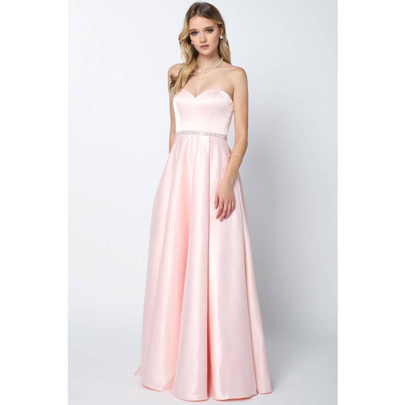7485 - Classic and timeless, 7485 is a stunning piece that will flatter any body type. Created with soft satin fabrication, this dress features a sweetheart neckline, flowy skirt with an elegant leg opening.