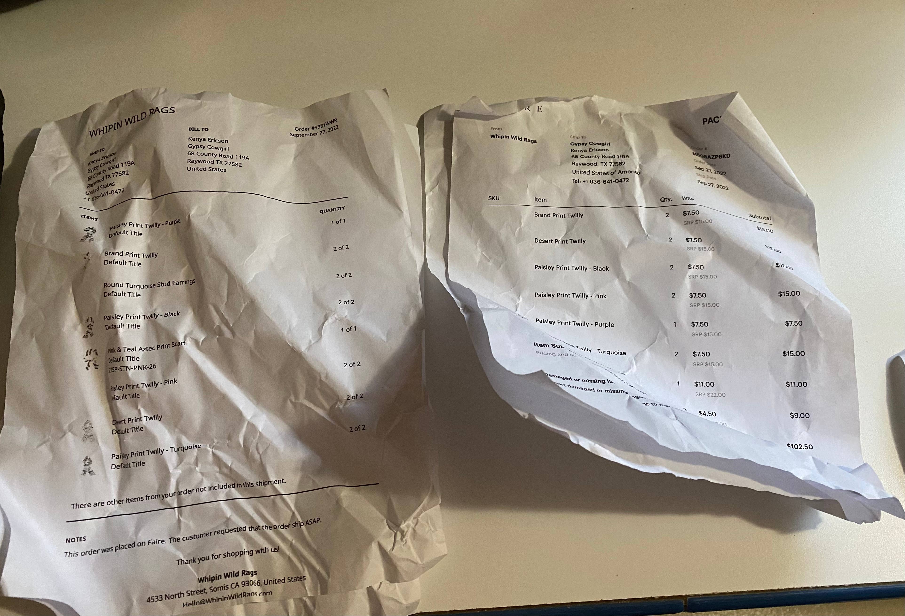 The wild rags showed up in good condition. The earrings were bent/broken & the paperwork was all crumpled. Looks like it went through a machine I guess.