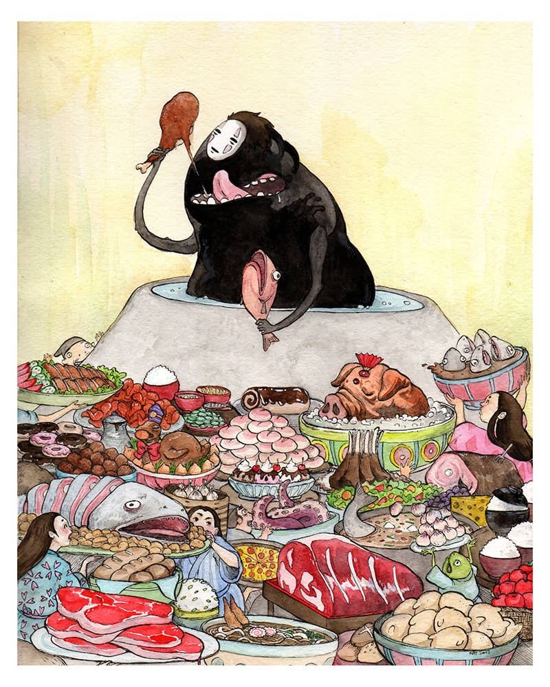 "The Spirit Feast" Print from my original illustration created for the 2017 Miyazaki tribute show at Spoke Art Gallery in San Francisco. Available as 8x10" and 11x14". ******************************************* Printed locally in Burbank, CA on Sundance watercolor card stock. Packaged in a plastic sleeve with logo sticker on the back.