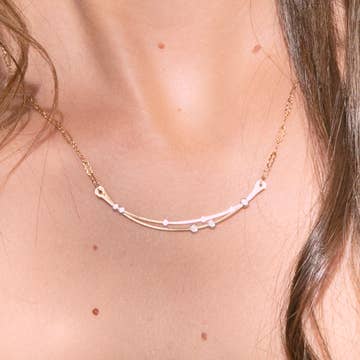 Our Crescent Necklace has us dreaming of faraway galaxies and starry nights. The Crescent Necklace is composed of sterling silver "stars" scattered on hand formed and hammered gold fill curves. The pendant features mixed metal layers on a gold fill or silver krinkle chain. Pair it with the Cosmos Mini Earrings or the Astral Mini Earrings for a cohesive look. Pendant size: approximately 2" in width All components are sterling silver or gold filled, nickel free Available on a 16", 18" (recommended) krinkle chain. Handmade in our Nashville TN Studio by an all-woman team wire jewelry | hammered jewelry | gold and silver mix metals | made in Tennessee | sterling silver | gold filled | demi-fine | handcrafted | artisan jewelry | dainty jewelry | minimalist jewelry