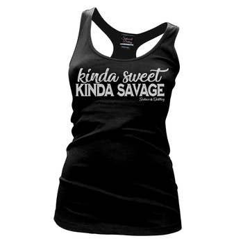Fitted cut • Screen printed design on front • Scoop neck • Sleeveless. Sku #4294 Black Racer Back Tank Top with White Graphic