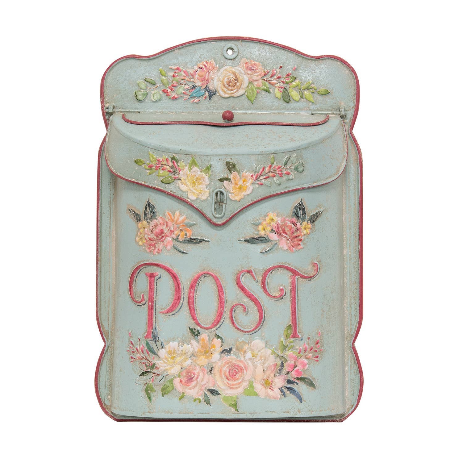 Busy Bee Hive Distressed Metal Post Box is a vintage-style metal mailbox. Box is painted white and it has been distressed for an aged look that complements a rustic home. Design is embossed with a honeybee and flowers and it features a honeycomb pattern to complete the bee theme. Mailbox includes a hinged lid for mail and stationery and it has two pre-drilled keyholes for hanging. Measures 14" high by 10" wide.
