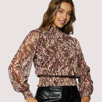 Make a bold statement with the Modern Muse Abstract Crop Top. Designed with a striking black and beige abstract print, this collared, wrap-style crop top features relaxed short sleeves and a flattering V-neckline. The wide waistband cinches at the waist, adding structure and definition to your silhouette. Its modern print and cropped fit make it a perfect match for high-waisted pants, faux leather leggings, or a sleek skirt, ideal for both daytime edge and nighttime glam.