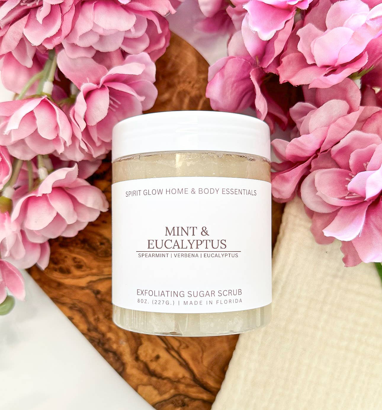 A refreshing blend of eucalyptus and garden spearmint brought together by notes of citrus, lavender and a hint of calendula. Our whipped sugar scrub combines goat milk soap, coconut oil and sugar to create a creamy body scrub to exfoliate, cleanse and moisturize your skin in one unique blend. Scented with phthalate free fragrance oils. Packaged in an 8 ounce PET plastic jar with a metal lid. Store in a cool, dry area out of direct water to maintain texture. Ingredients: sugar, glycerin, water, sodium cocoyl isethionate, sorbitol, propylene glycol, disodium lauryl sulfosuccinate, stearic acid, sodium chloride, olive oil, coconut oil, fragrance, goat milk, diazolidinyl urea and iodopropynyl butylcarbamate (preservative), iron oxide, mica