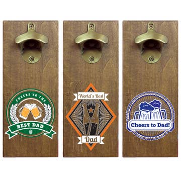 A bottle opener made from a real hockey puck. We carve out one side of the puck with our CNC router, then drop in a small magnet, which catches the cap, and a stainless steel plate. In addition to being a bottle opener they make great coasters too! We do have an in-house UV digital printer that we can use to print any logo, photo, or graphic directly onto the puck. If you would like to see a digital proof please send us a message here on Faire and we'll get back to you with a mockup within 1 business day. The added cost for customization is $1. If you order a combination of 24 PuckOpeners you get our wood product display for free!