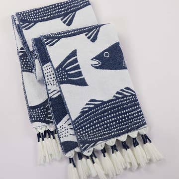 EKO - Shad Fish Throw Blanket Colors may vary from photos shown. Each product is carefully hand-made, on demand for each order. We thank you for your patience as we create, package and ship this product especially for you. Actual colors may vary slightly from what you see on screen. Medium: 50" x 60" Our premium natural cotton throws are lightweight and super soft to touch, beautifully textured and wonderfully cosy. Made from 100% cotton, our throws boast the finest quality yarn stitched in a thermal weave to create a breathable, luxurious finish. Perfect for bed or couch, this classic blanket adds a great finishing touch to any interior. Our made on demand blankets are both odor and stain resistant, and easy to maintain. They resist wear and tear, as well as being hypoallergenic and ideal for sensitive skin. * Odor and stain resistant * Hypoallergenic, machine washable and low maintenance * Colorful fringe