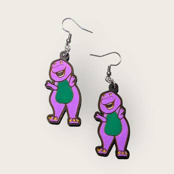 Go Go Godzilla! These statement Kaiju earrings are sure to turn heads! Featuring a shimmery marbled green and purple acrylic with gold flecks, hand painted details, and pink fluorescent detail. Due to the nature of the marbled material, each pendant will be totally unique and differ slightly from picture. Laser cut acrylic with painted details. Pendants are 1.675” tall, 2.5” earring drop, 1.375" wide. Hypoallergenic gold plated earring hooks. Comes on a decorative card.