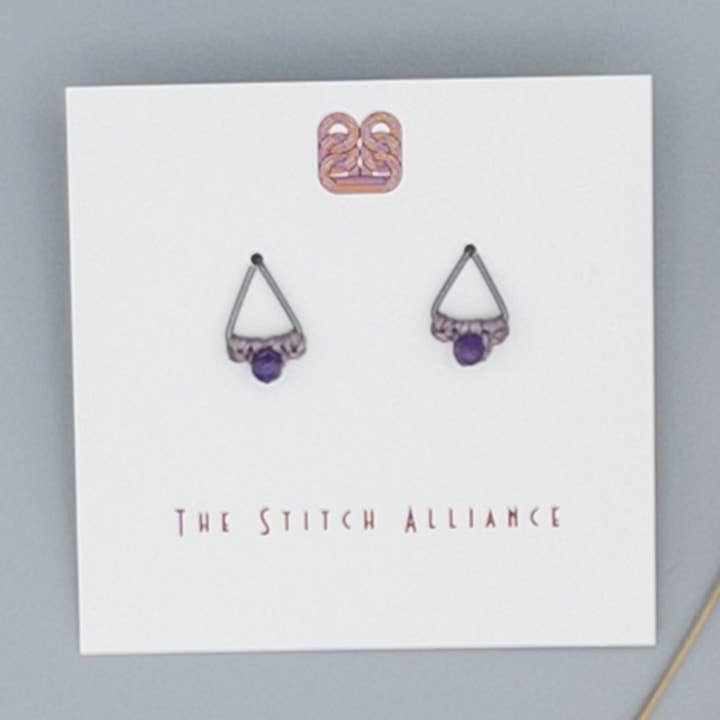Handmade aquamarine stud earrings in oxidized sterling silver with just a touch of macrame! Oxidized sterling silver 20 gauge wire in a hand-formed triangle is adorned by a 4mm faceted aquamarine bead attached with a simple macrame knot. Water-resistant, wear them all day for all of your adventures! Earring Length: 5/8" Earring Width: 3/8" This style is available in 14k gold-fill and sterling silver with many gemstone options. See my collections for the full selection. The Stitch Alliance is a small, artist-led business located in Southern California. All items are handmade in North San Diego County using ethical practices. ********************** These earrings are: handmade earrings, triangle earrings, minimal earrings, handmade earrings for women, handmade earrings USA, gemstone earrings, boutique jewelry, stud earrings, birthstone gift, March birthstone gift These earrings are perfect for: birthday gifts, gifts for her, unique gifts, gifts under $25, handmade gifts