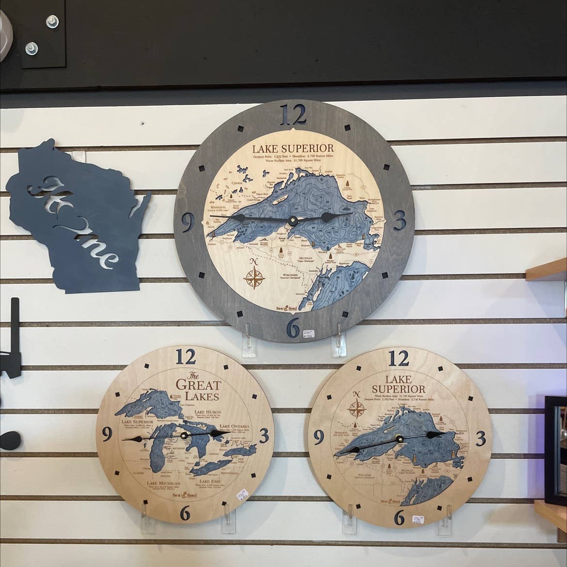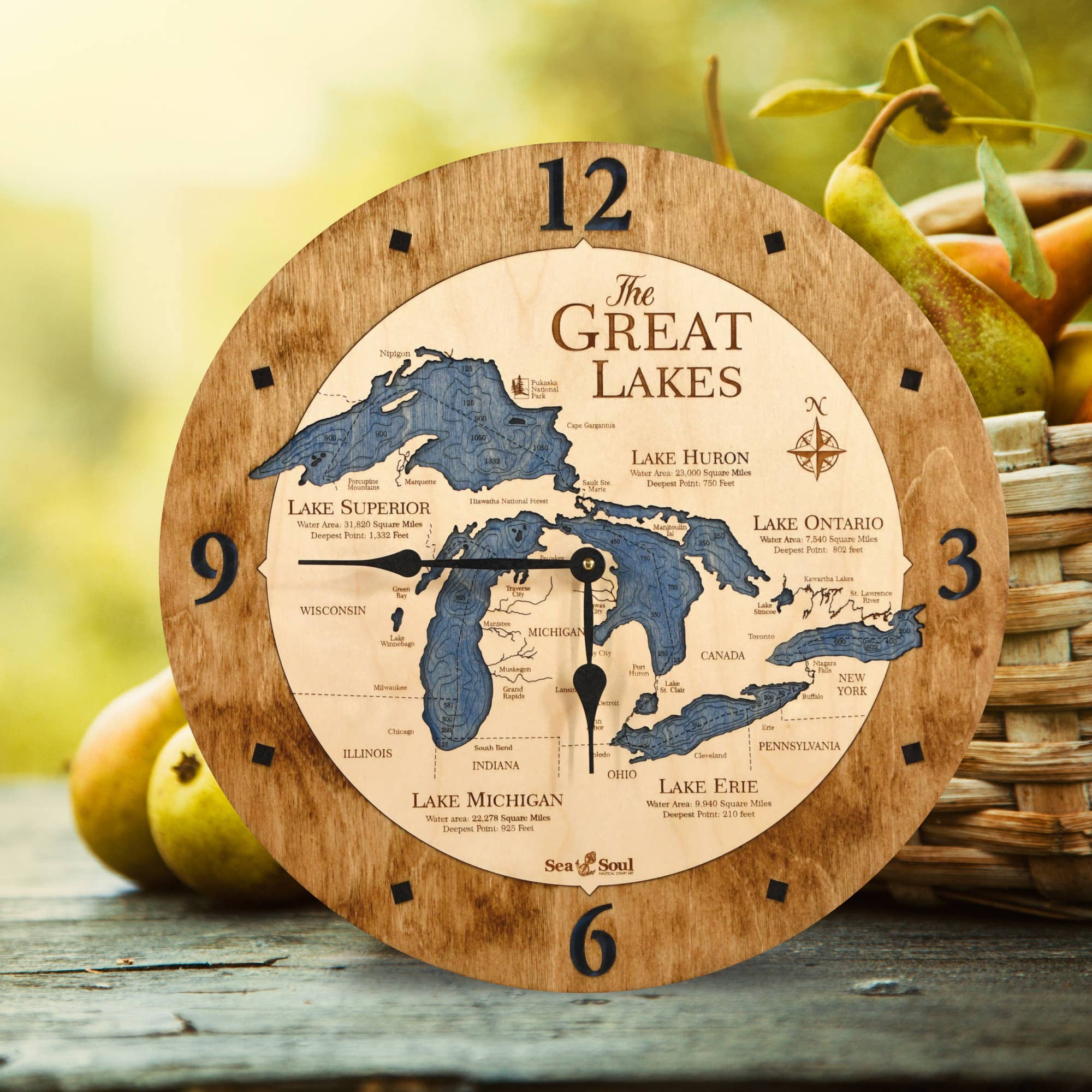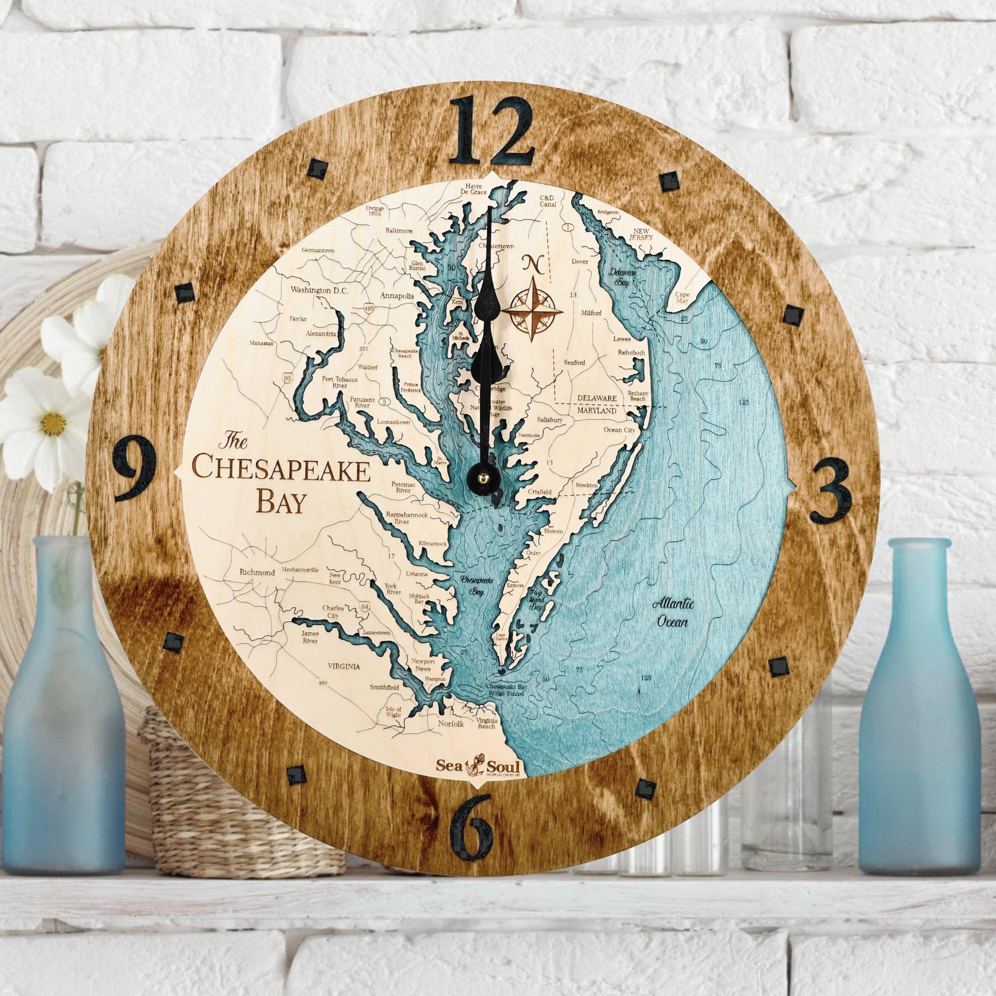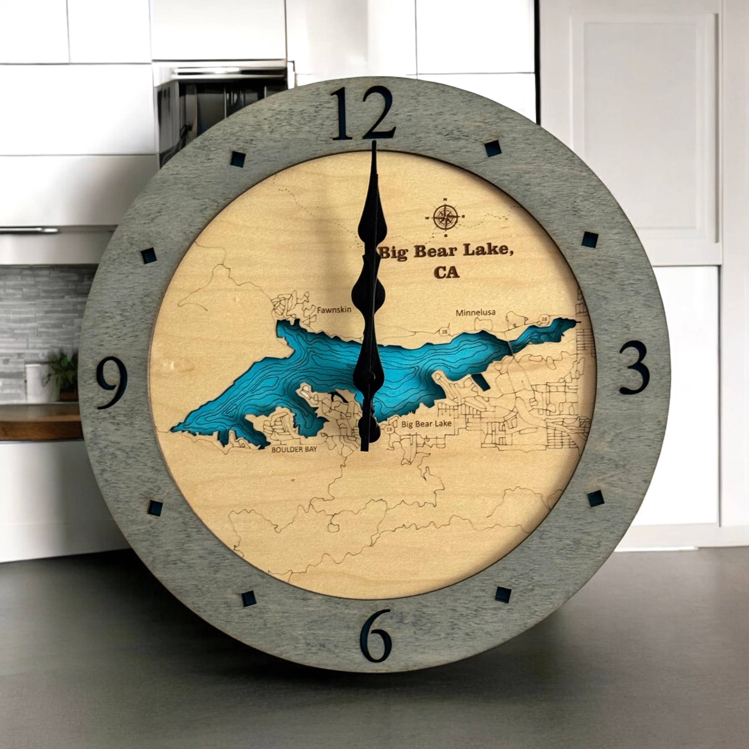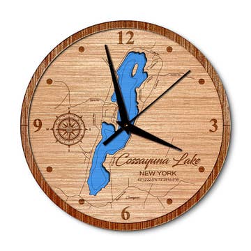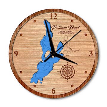 Beautiful Claytor Lake Virginia Lake Map Wood Wall Clock - 4 Sizes · Made in the USA · Made of rich Baltic Birch · Size: 12" ALL BIRCH ONLY · Size: 16”, 24” or 36” available with Accent Ring · Available in Deep Blue or Blue Green Water Stain · Offered in all Birch or with Bleached Blue, Driftwood Gray, Warm Americana, Golden Honey accent ring · Quartz mechanism operates on one AA battery, not included. Combining a creative use of new technology with time-honored techniques produces the signature look of Sea & Soul Nautical Chart Art. All of our topographic nautical depth charts are hand rendered in beautiful detail by our graphic artist using a combination of maps. The art is then laser cut and engraved in our wood shop in Wisconsin. Our wood workers then hand stain and assemble each chart with the water depicting the depth contours one level below the shoreline for a wonderful 3D effect. It is this attention to detail that gives Sea & Soul products a gallery quality look and feel.