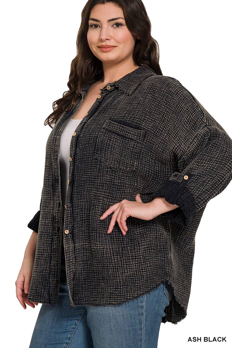 ***Image usage is allowed to the buyers who purchase from us via Faire only. SI-24922 MINERAL WASHED DOUBLE GAUZE BUTTON DOWN SHIRT - MINERAL WASHED DOUBLE GAUZE - BUTTON-DOWN - ROLL-UP LONG SLEEVE - FRONT POCKET - BACK PATCH * Each item is unique, expect variations in color and finishing TOTAL BODY LENGTH: 27.5", BUST: 46.5" approx.- MEASURED FROM SMALL Fabric Content: 100% COTTON AnchorBestseller SI-24922 Mineral Washed Double Gauze Button Down Shirt (100% COTTON) LAVENDER-156762 SAND BEIGE-156765 VIOLET-156767 FUCHSIA-157399 DUSTYTEAL-158123 BRIGHTMAUVE-160507 LTTEAL-160508 OCEANBLUE-160509 MAUVE-161241 ASH BLACK-165844