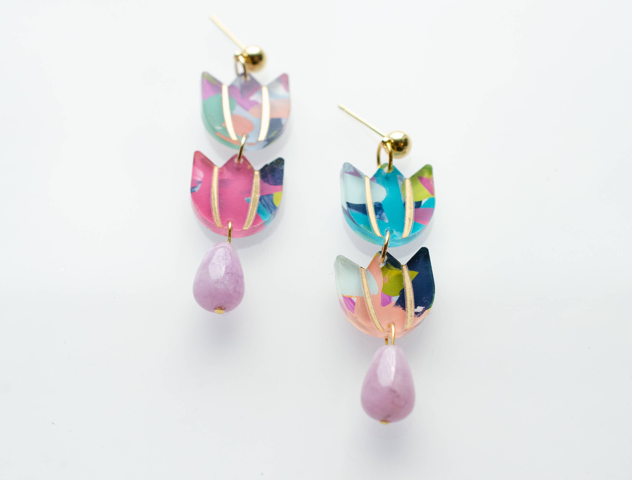 Aurora Dangle Earrings DETAILS: Length: 2 inches Nickel and lead free, with a gold plated sterling silver post. Earrings are cut from abstract hand painted acrylic, so they will arrive mismatched!