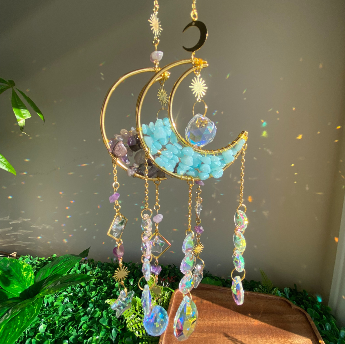 Catch the morning sunshine and spread rainbows around your home with our brand new macrame prism rainbow makers! Made with a 4 inch golden ring and 1 inch prism crystal, this accessory is petite but packs a big punch of little rainbows when the sun beams through it.