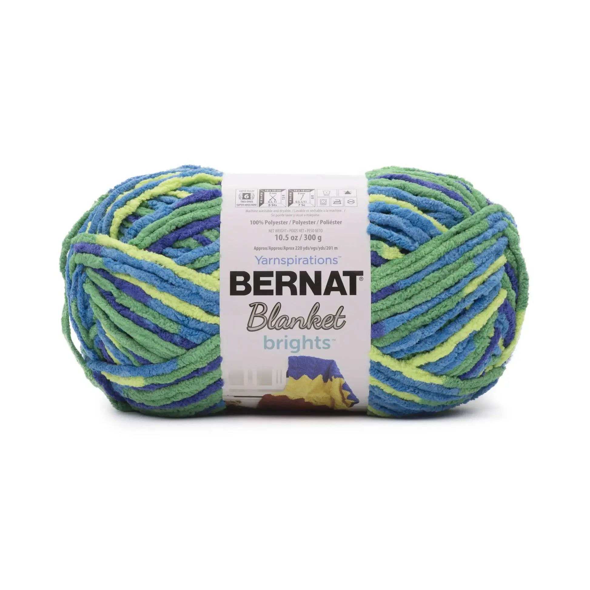 Speckled with droplets of colour, Bernat Blanket Speckle creates a supple, lightweight easy care fabric. Choose a speckly shade all on its own or combine it with other yarns in the Bernat Blanket family. FEATURES: Content: 100% Polyester Ball Size: 300 g/10.5 oz, 201 m/220 yds Care: Machine Wash in Cool Water Delicate Cycle Gauge: #6 Super Bulky Knitting Gauge: 4" x 4" (10 cm x 10 cm) 8 sts and 13 rows with a 8 mm (U.S. 11) knitting needle Crochet Gauge: 4" x 4" (10 cm x 10 cm) 7 sc and 8 rows with a 8 mm (U.S. L/11) crochet hook Recommended Knitting Needle: 8 mm Recommended Crochet Hook: 8 mm