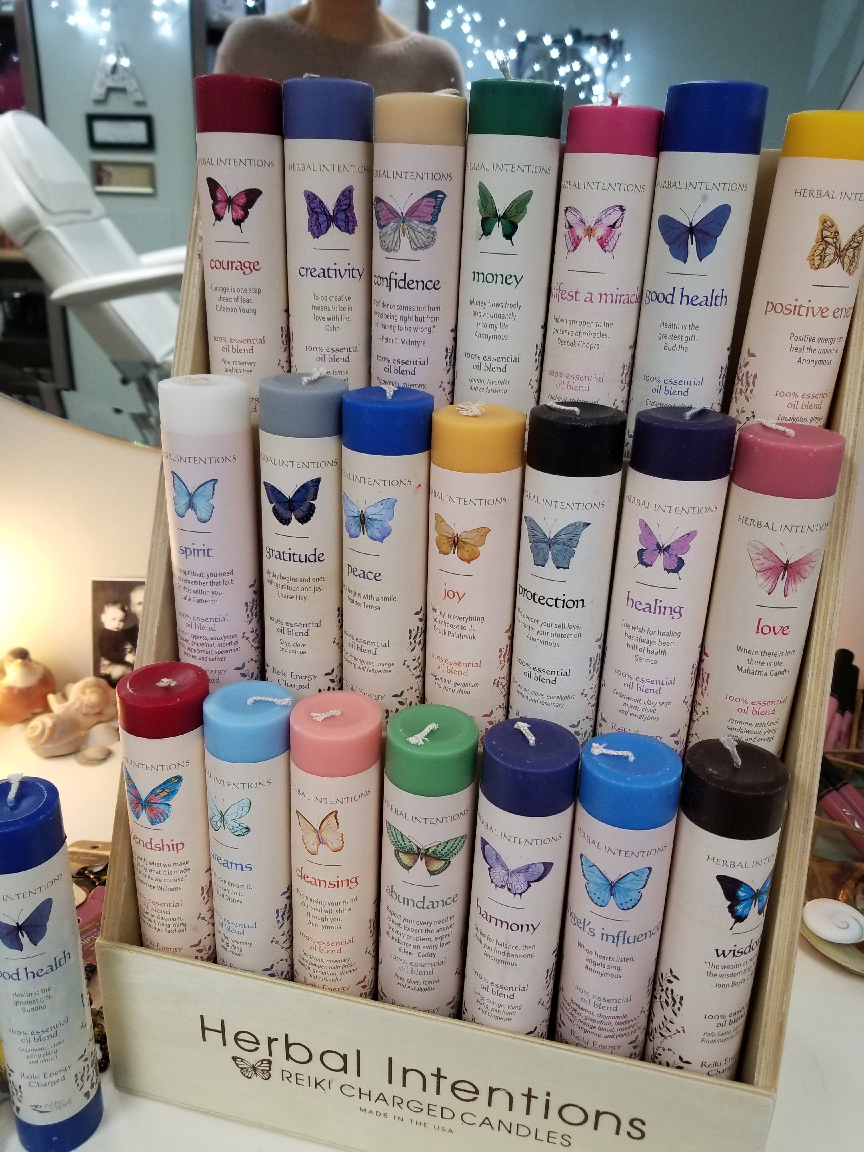 Scented Herbal Intentions Candles are each created with a particular intention in mind. Made with 100% essential oils, each candle is also Reiki Energy Charged. Each candle measures approximately 1.5" x 7" and is beautifully colored and scented. Choose from 21 Intentions: Abundance: Angel's Influence: Confidence: Cleansing: Courage: Creativity: Dream: Good Health: Gratitude: Harmony: Healing: Joy: Love: Manifest Miracle: Money: Peace: Positive Energy: Protection: Spirit: Wisdom: https://faire.com/direct/inkarripeaceandwellness