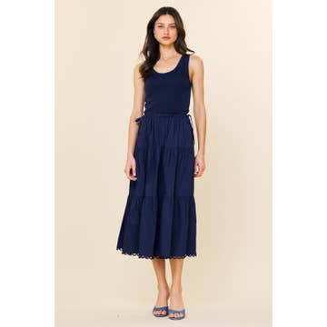 Dress - Navy Textured, Tiered Tank Dress, Tie Detail, Ruffle Neck, Knee Length Dress