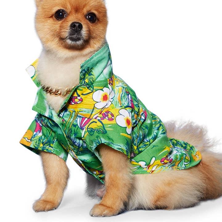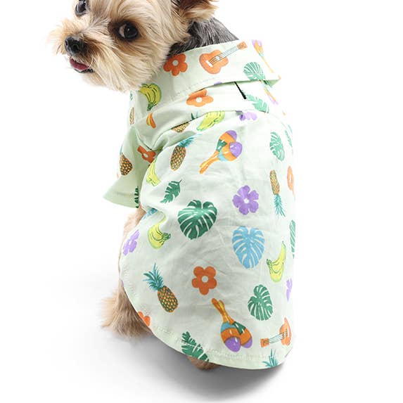 Don't forget this shirt before heading to the beaches! Light cotton button up shirt with one of a kind tropical island pattern. Leash hole right below collar.