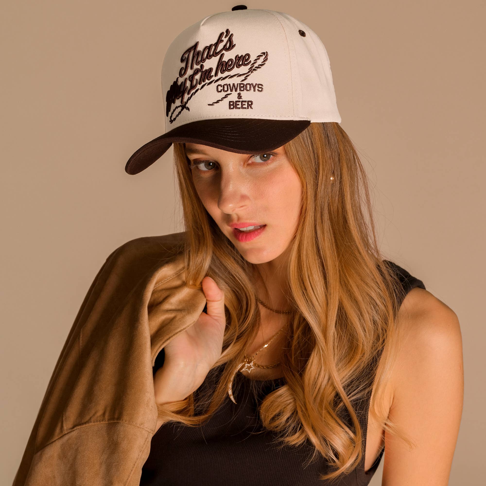 C.C THAT'S WHY I'M HERE COWBOYS & BEER Letter Embroidered Cotton Trucker Snap Back Cap 100% Cotton Circumference : 22.5" Made in Vietnam